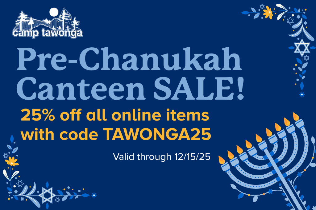 Treat your loved ones to some Tawonga swag this Chanukah! Valid through December 15, 2025, use code TAWONGA25 for 25% off all online canteen items! Shop our retro 100th anniversary hoodie, the beloved songbook, Owala-esque water bottles, baseball hats, T-shirts, teddy bears, fanny packs, and more. Happy Chanukah Tawongans!