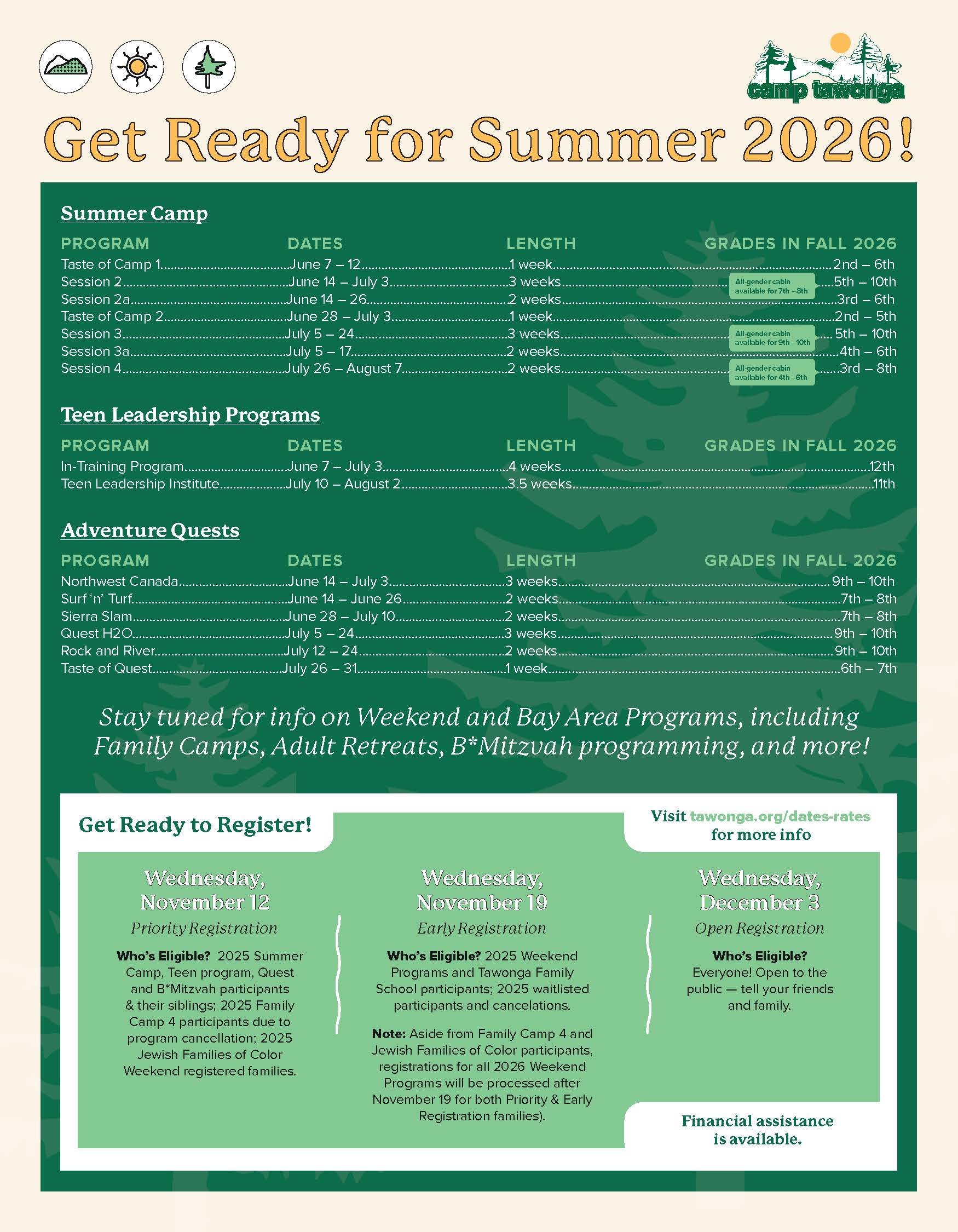 Are you ready for another epic summer at Camp Tawonga? So are we! 2026 Registration opens in November, starting with Priority Registration. Stay tuned for virtual information sessions, enrollment instructions, and more. We can’t wait to see you among the tall, tall trees. 🌲
