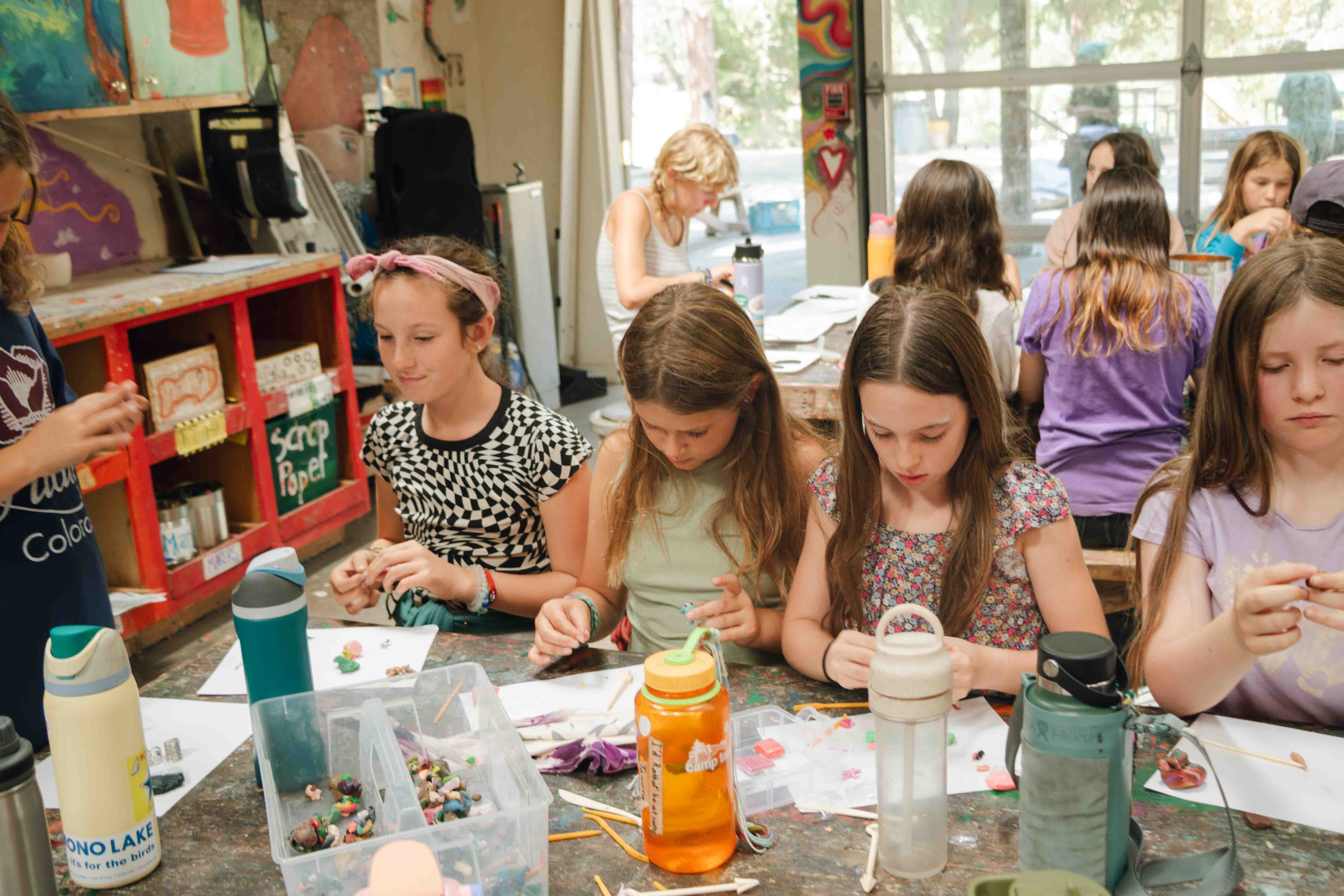 Each day, the studio buzzes with activity as campers dive into an ever-changing lineup of blocks. It’s also consistently one of the most popular spots during Camper Floats — with kids streaming in to finish projects, start new ones, or just soak in the creative energy. They might find themselves sculpting miniature animals out of Sculpey clay, tie dyeing a shirt in every shade of sunset, or painting watercolor postcards to send home. “Anything But Brushes” invites campers to ditch the paintbrush entirely and experiment with pinecones, sponges, yarn, or even their toes! In mobile making, they carefully balance twigs, beads, and thread to create dangling works of art, while embroidery brings new life to old fabric with every careful stitch. Whether it’s a spontaneous collage or a carefully planned friendship bracelet, every creation is a celebration of self-expression.