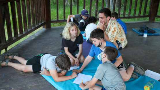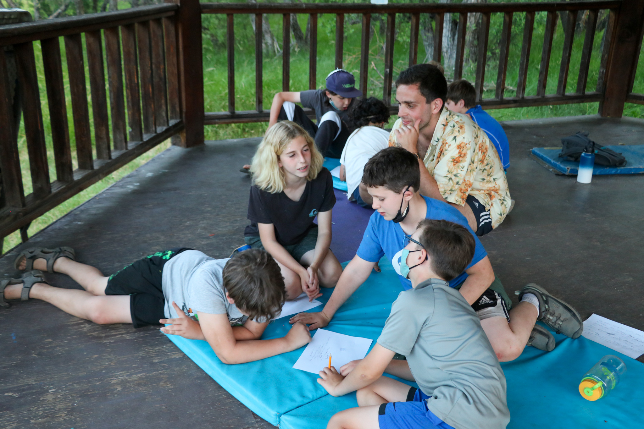B-Aleph sings songs with one of the Camp Tawonga song leaders at Cookie Corner