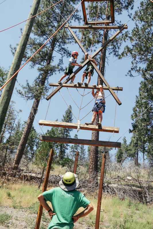 In the morning, kids work together as a bunk to build trust and to collaborate through the challenges of the low elements, which don’t require harnesses and helmets– these are team building games designed to get them ready for the climbing to come. In the afternoon, campers are introduced to the high elements, strapping on their harnesses and helmets and climbing to the top, helping each other along the way. With cheers and reassuring words from staff and peers below, many campers find new edges they didn’t know they could reach. Empowered to support each other to push their limits, campers truly embody the value of “challenge by choice” during these triumphant moments.
