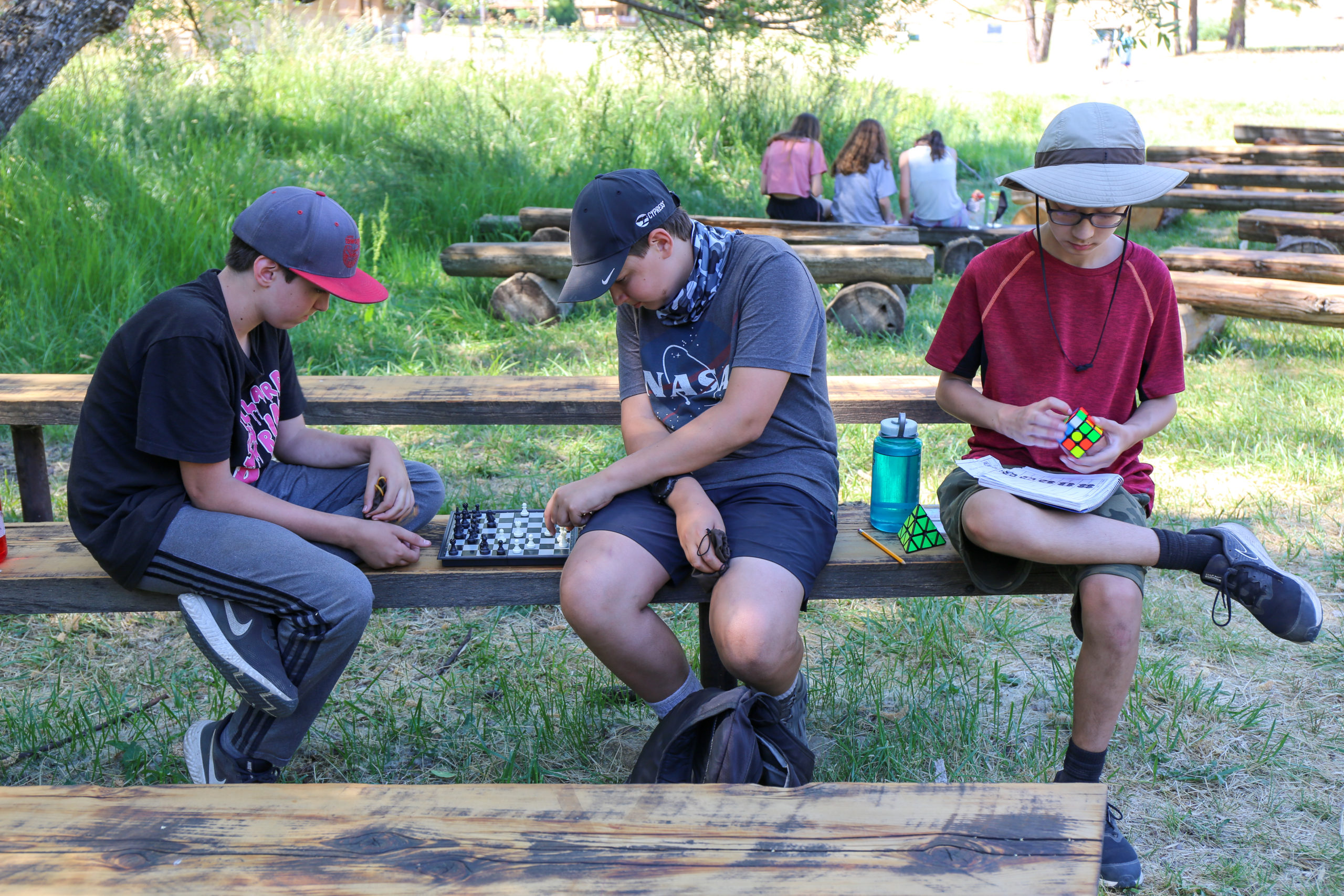 At floats anything goes. These campers found a shady spot to play chess and work on the Rubix Cube.