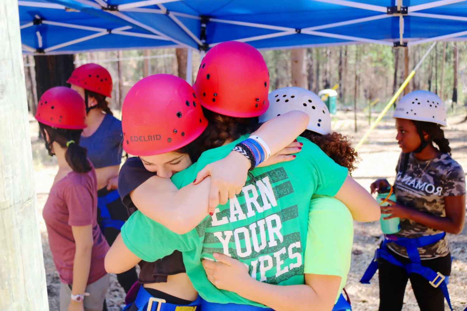 Then in the afternoon, campers are introduced to the high elements, strapping on their harnesses and helmets. Each bunk engages with one element and decides how far they would like to take it. With cheers and reassuring words from staff and peers below, many campers find new edges they didn’t know they could reach. Empowered to support each other to push their limits, campers truly embody challenge by choice during these triumphant moments.
