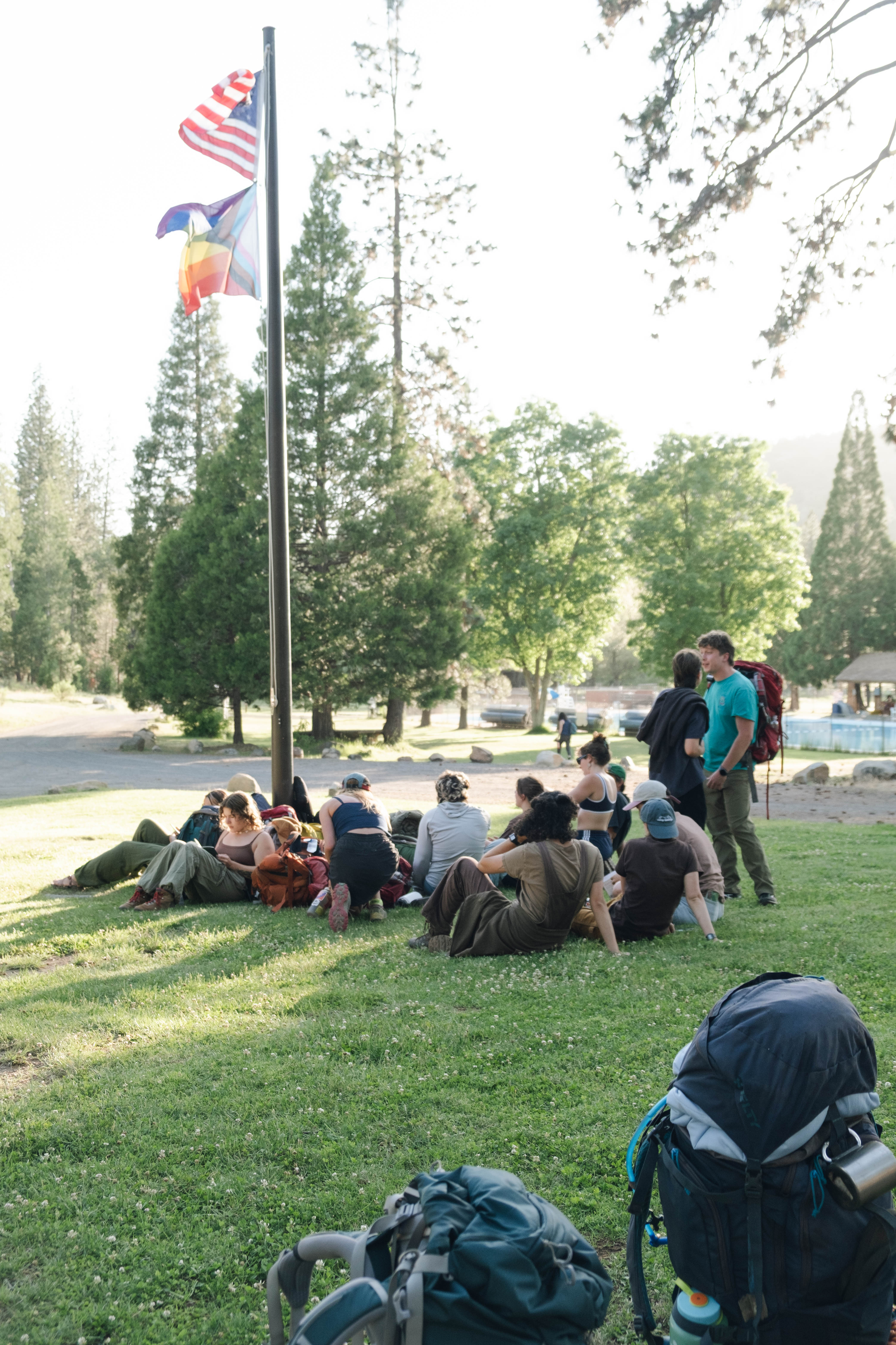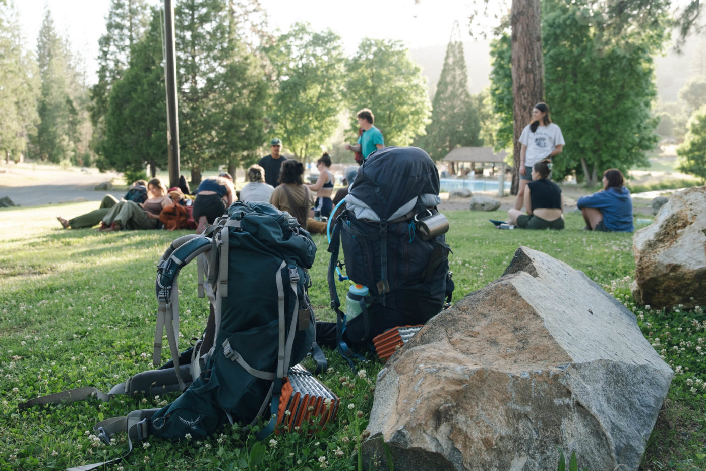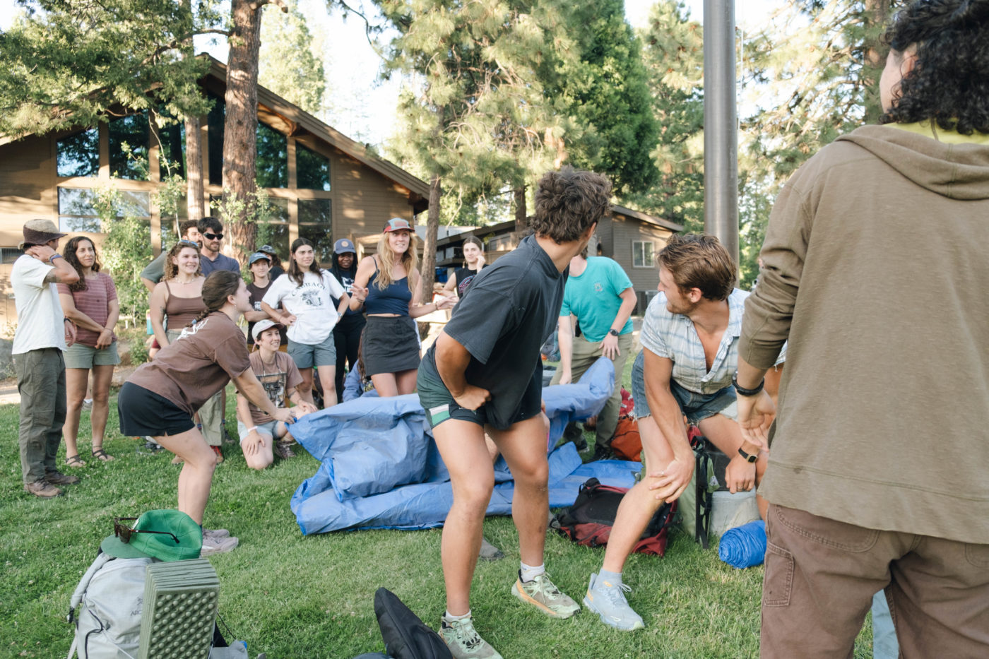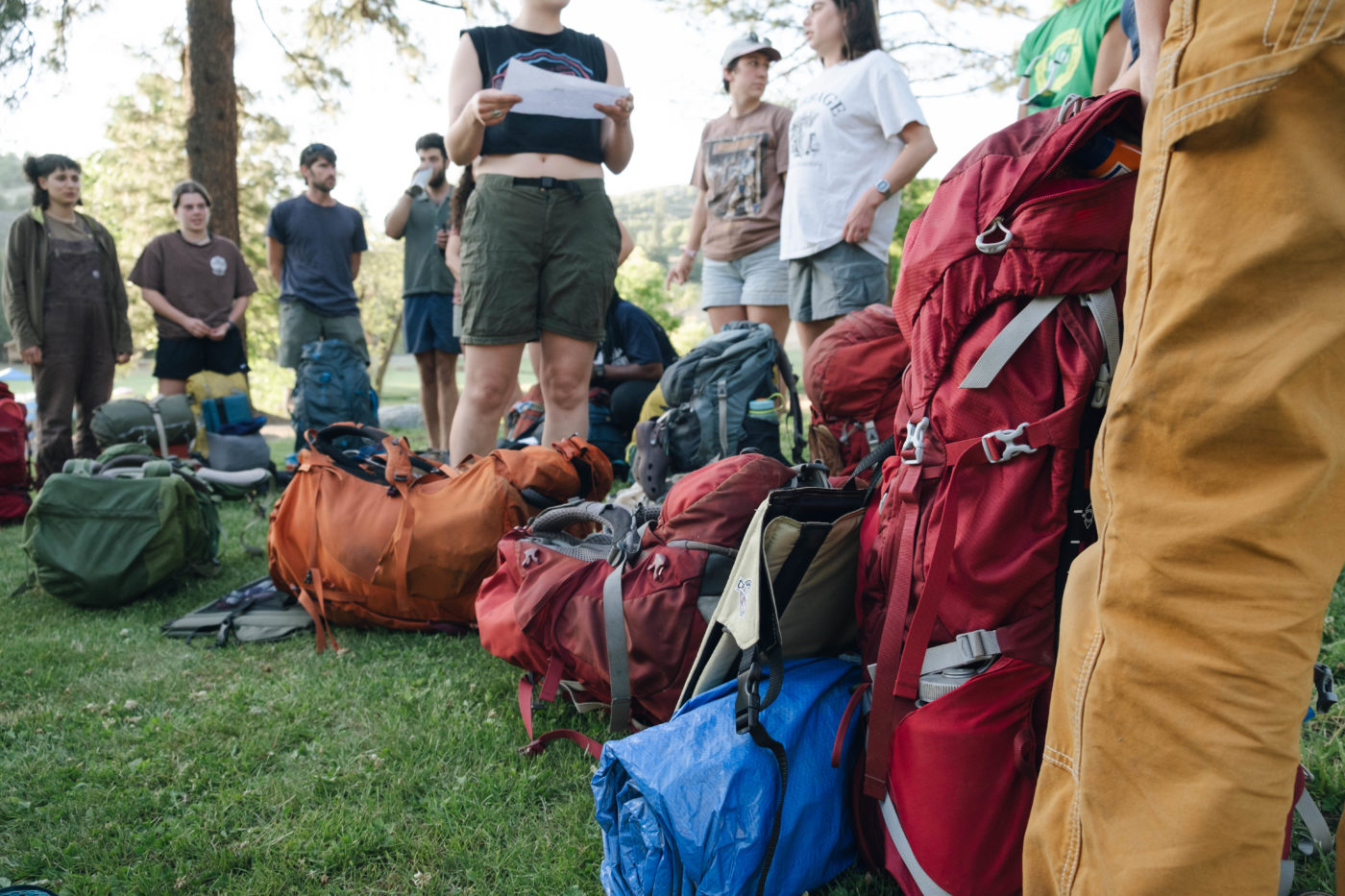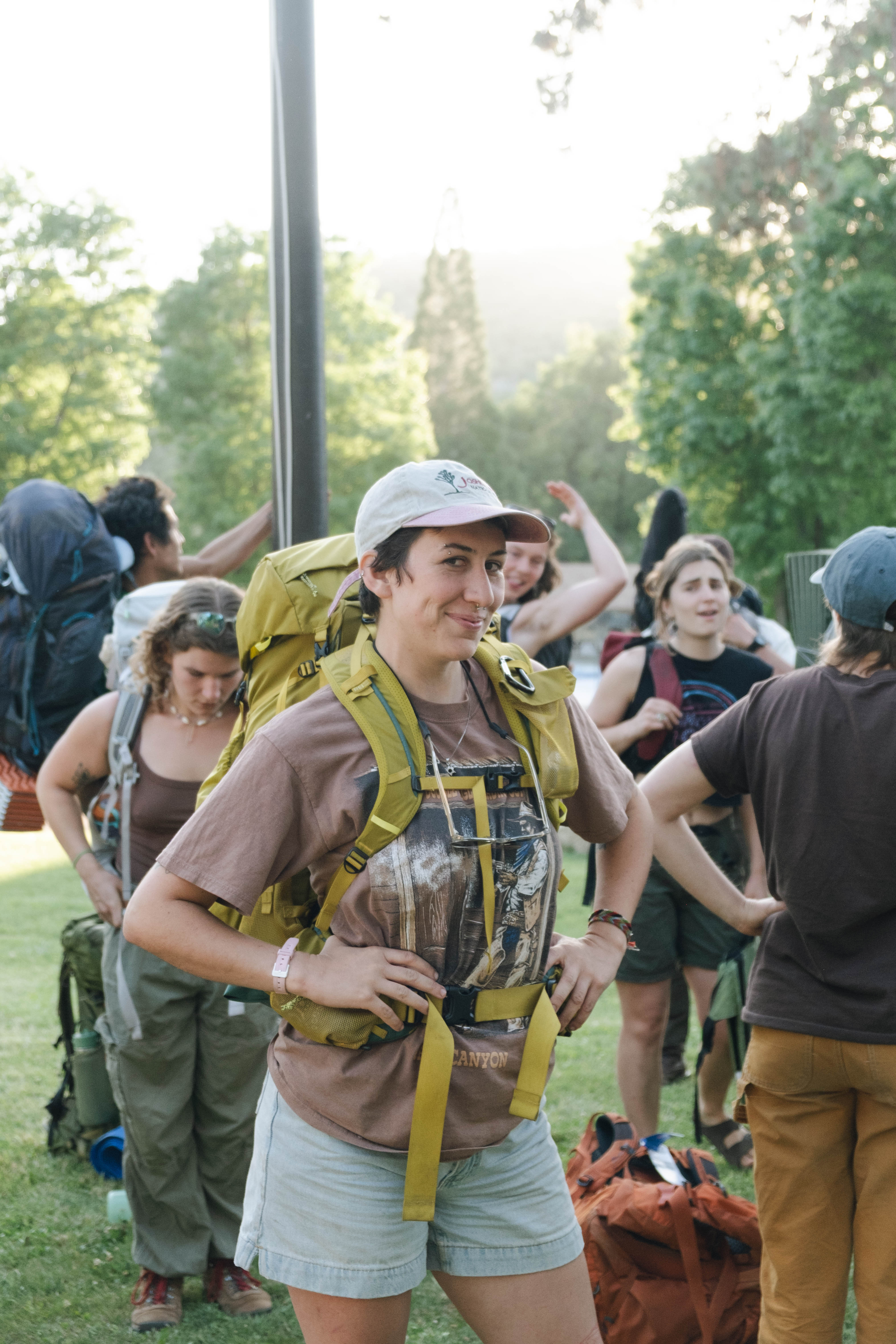 Counselors about to embark on their "fackpacking" (fake backpacking) trip, led by Wilderness staff, to prepare for upcoming camper adventures