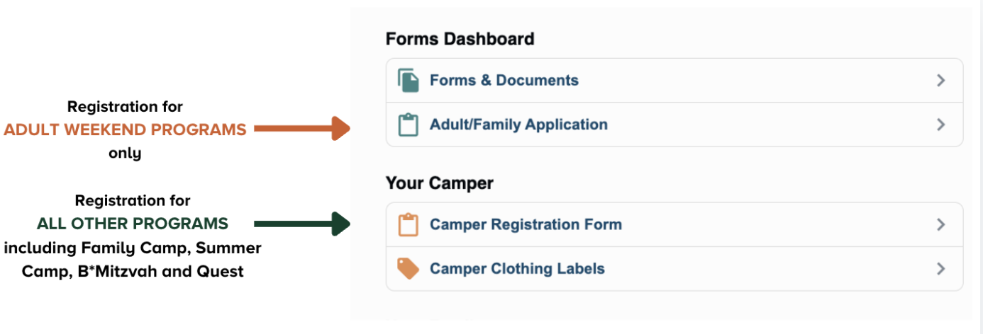 When registering for an adult weekend, select “Adult/Family Application.” For other programs, select “Registration Form.” (See below.)