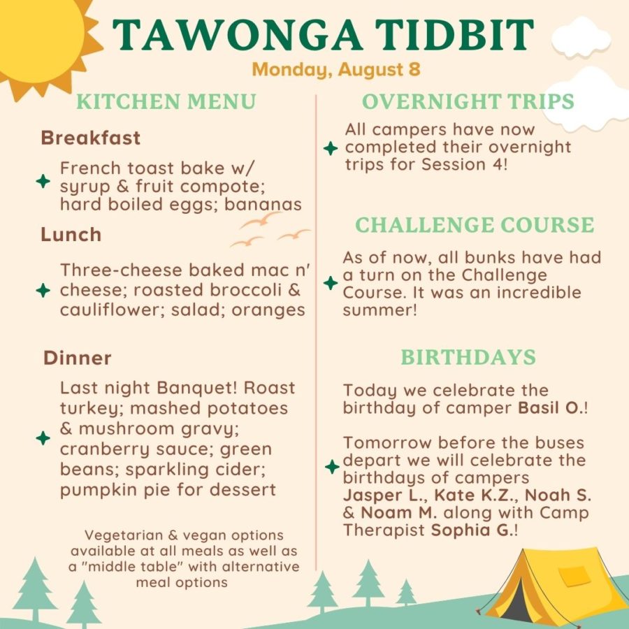 At closing campfires tonight, campers will get a chance to reflect on the past two wonderful weeks and celebrate all the joy and growth they’ve shared. One sweet Tawonga tradition is memory sheets; all members of a bunk contribute to this compilation of favorite memories, inside jokes and silly quotes, and everyone gets a sheet to take home. At the closing campfire, campers will get to share some of these memories with their unit, and thank the counselors and other staff who’ve supported them through their Tawonga journey.