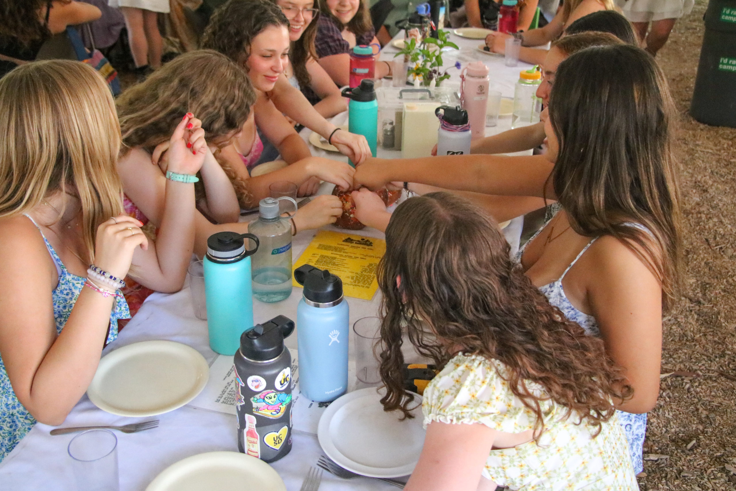TLI led us in the Fiddler on the Roof “Sabbath Prayer” with gusto, followed by our classic Shabbat feast, capped off by shabbobler (Shabbat cobbler). Our extended, spirited Shabbat song session after dinner, known as freilach, was a total highlight – our songleaders Devin and Shiloh rotating between traditional Israeli folk songs and pop tunes.