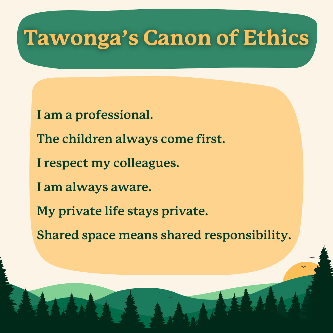 Setting the tone for the full Canon is the first principle, “I am a professional.” For Tawonga summer staff, embodying this ethic entails maintaining a high standard of competence and integrity in their roles. It involves prioritizing the well-being and safety of campers while upholding professional boundaries and responsibilities. By embracing this ethic, Tawonga staff members commit to fostering a positive and enriching environment for all participants, rooted in professionalism and dedication to their duties.