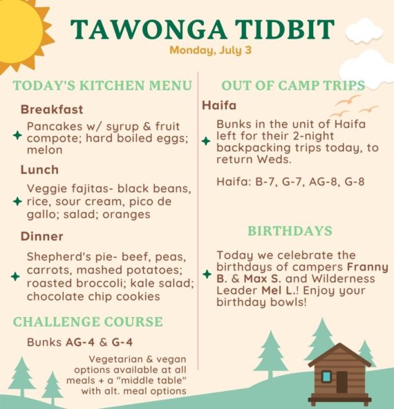 We’re all looking forward to the rest of the session with our incredible campers and SCITs, as well as the many Tawonga end-of-session traditions coming up – closing campfire, banquet dinner, carnival and more. Thanks for tuning in!