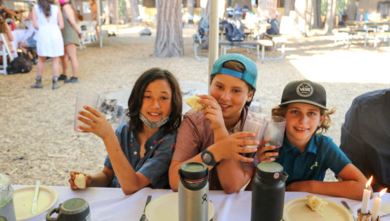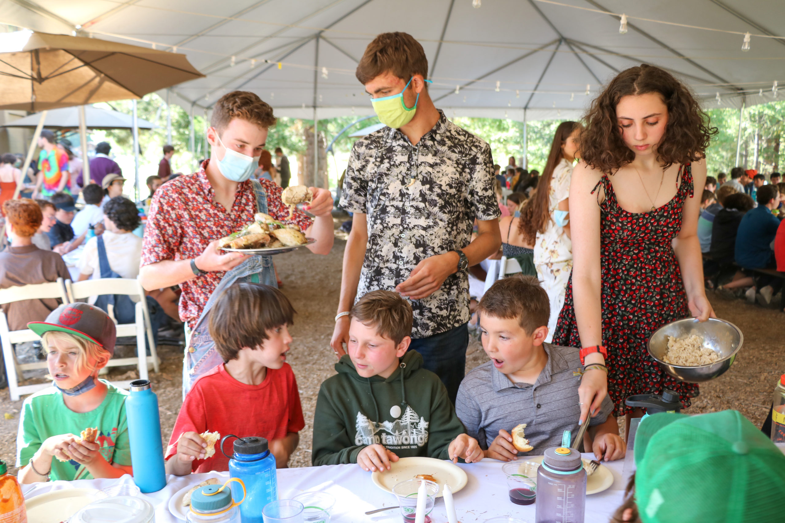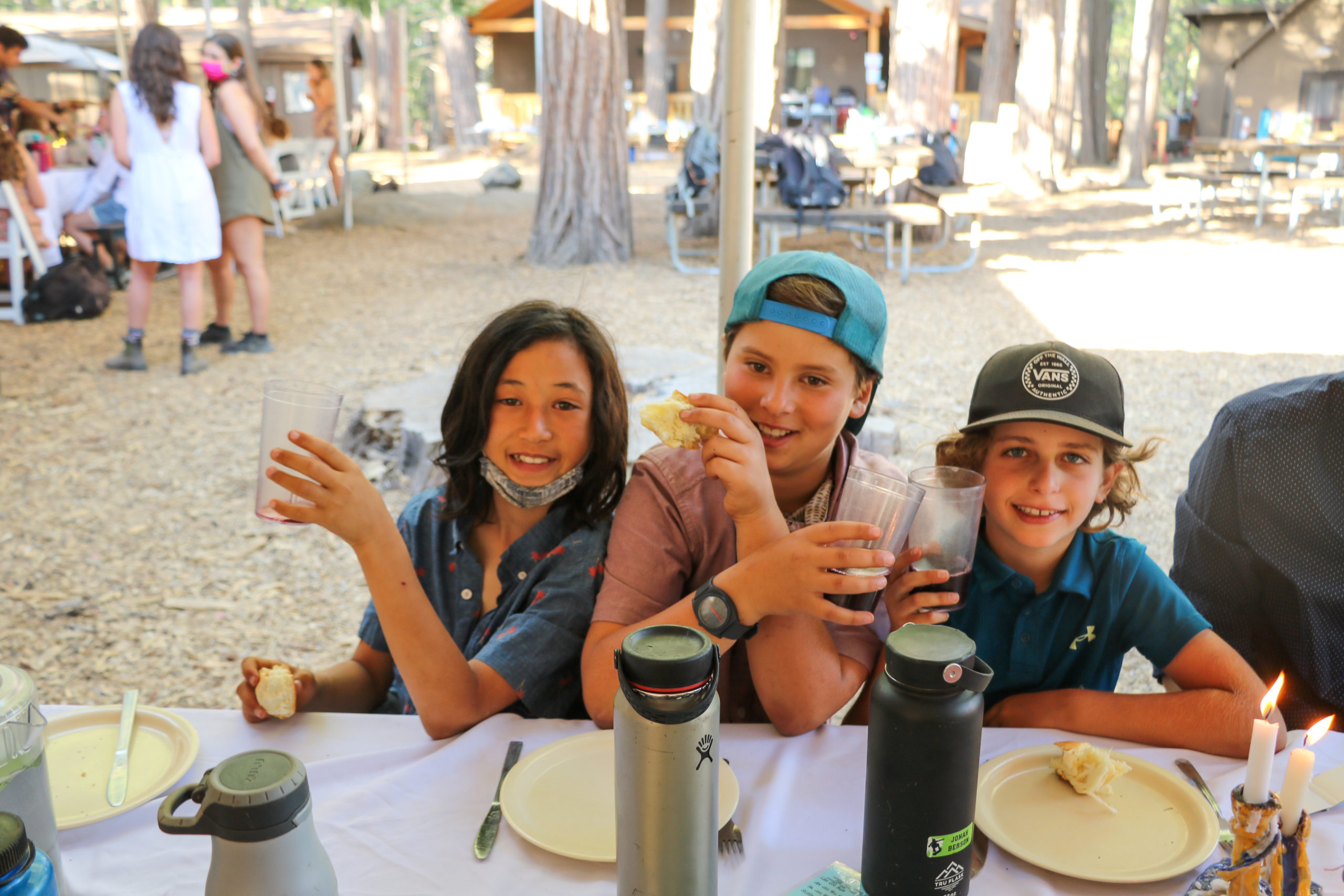 We began our Shabbat stroll on the Ridge Side of Camp and picked up each bunk one by one in a long procession, heading towards the River Side before arriving at the dining pavilion. Shabbat always begins with blessings over the candles, wine (grape juice) and challah, followed by the Sabbath prayer. Dinner was delicious as usual, and campers seem to have agreed that Tawonga has the best grape juice in the world!