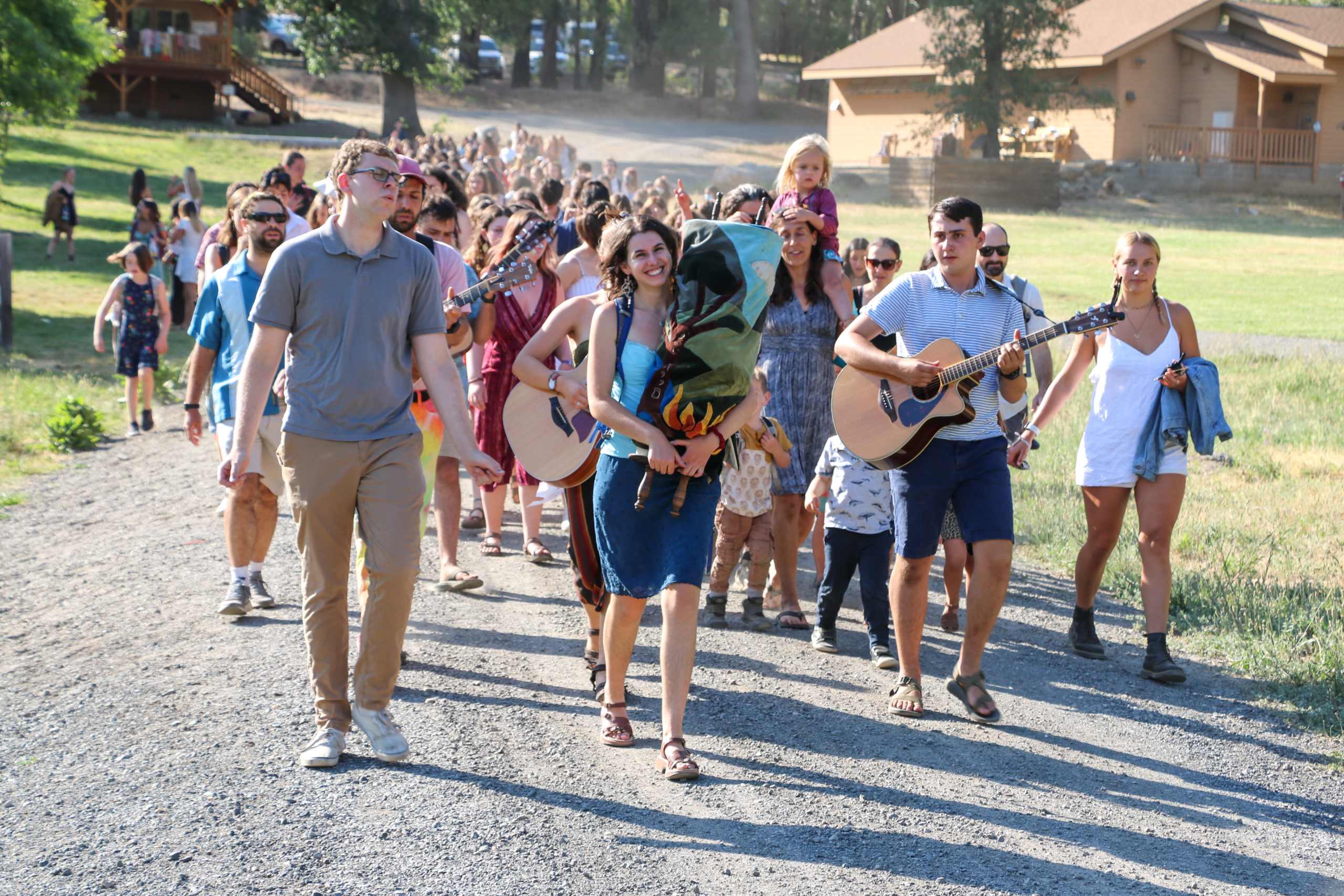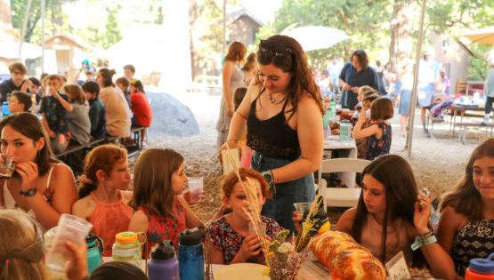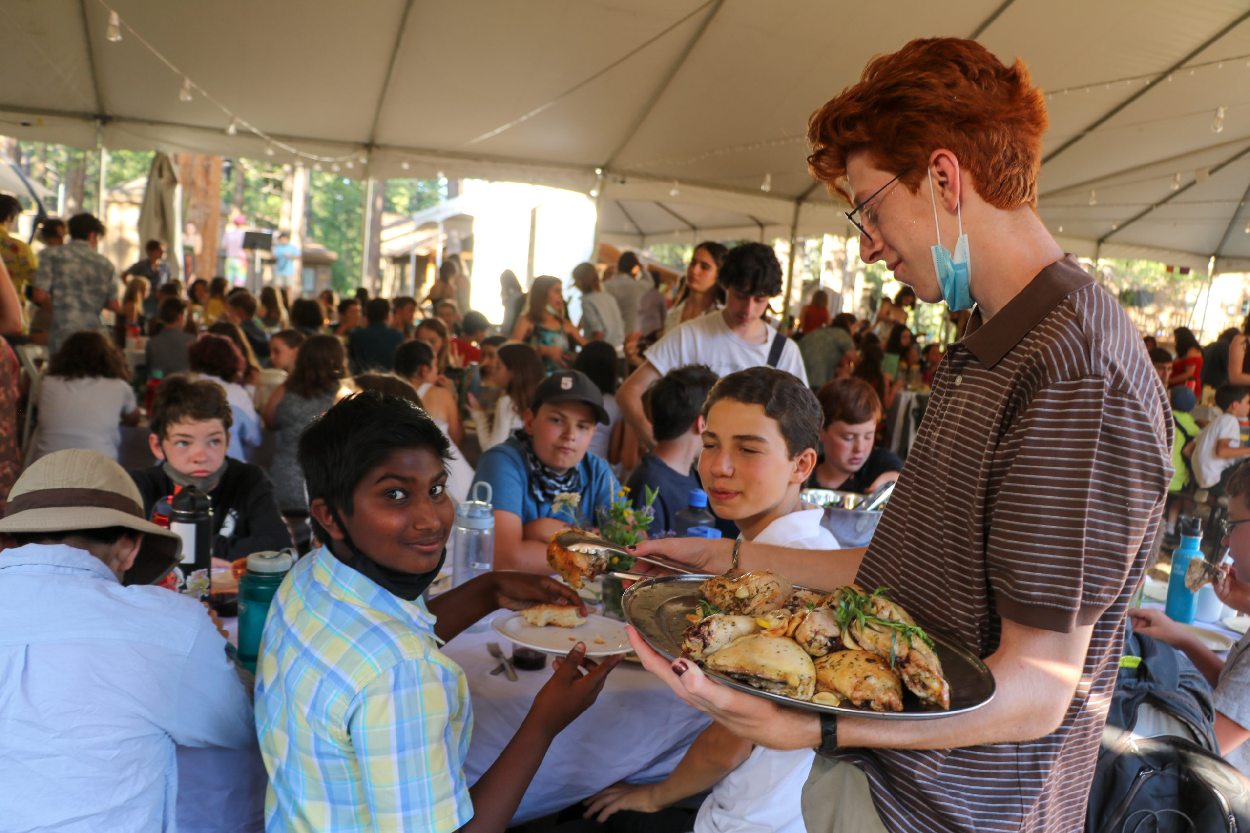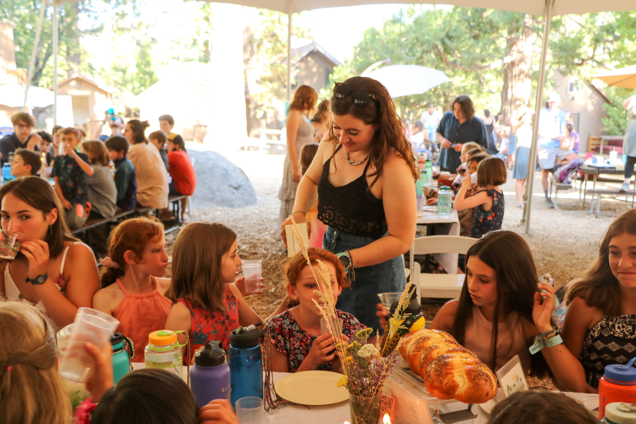 We began our Shabbat stroll on the Ridge Side of Camp and picked up each bunk one by one in a long procession, heading towards the River Side before arriving at the dining pavilion. Shabbat always begins with blessings over the candles, wine (grape juice) and challah, followed by the Sabbath prayer. Dinner was delicious as usual, and campers seem to have agreed that Tawonga has the best grape juice in the world!