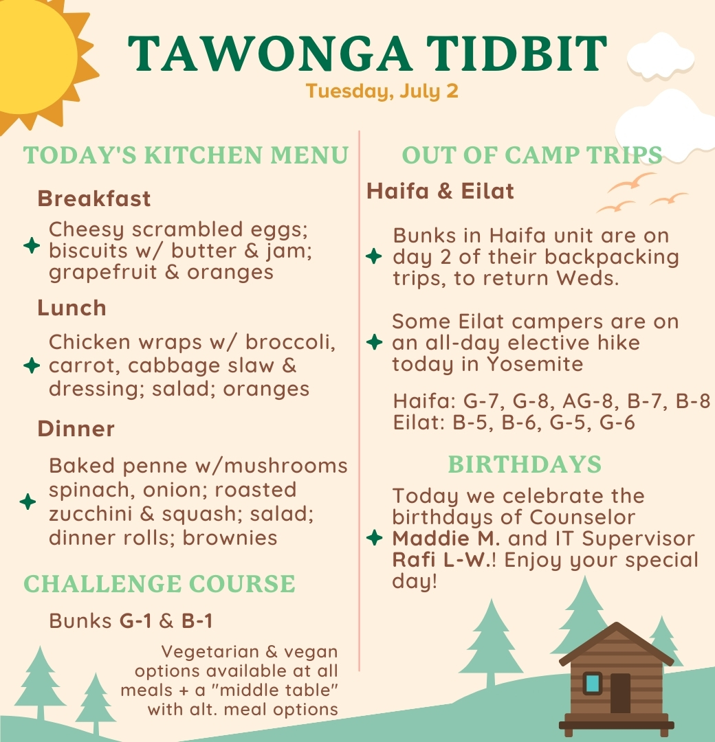 In wilderness news, the unit of Haifa is the last to complete their backcountry backpacking trips, returning back to Camp on Wednesday. Meanwhile, our Session 2b campers will head out on their day hikes tomorrow. Hopefully they’ll come back to Tawonga next year for a longer session to experience an overnight trip! Everyone is getting excited for the all-Camp production tomorrow night to see campers’ share their dramatic sides. Read on below to learn about this summer’s fabulous Specialists and Counselors-In-Training: