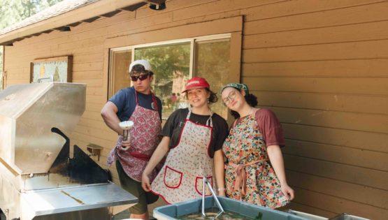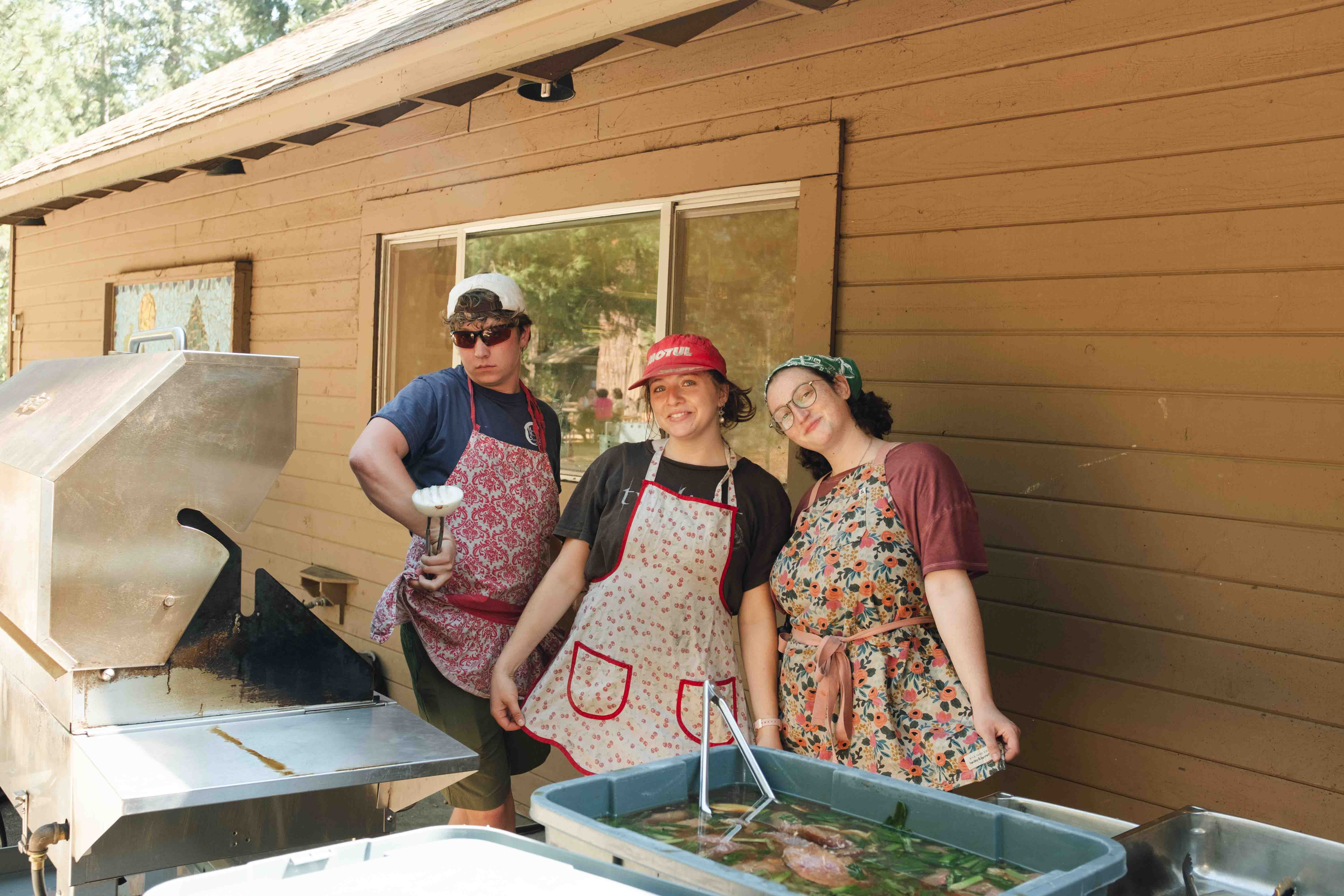 Staff members, (left to right) Sam, Roxy and Grace grilling for International Dinner!