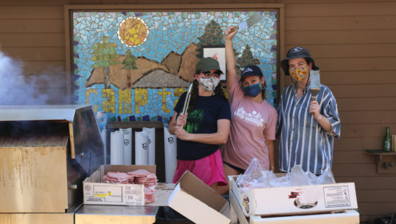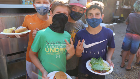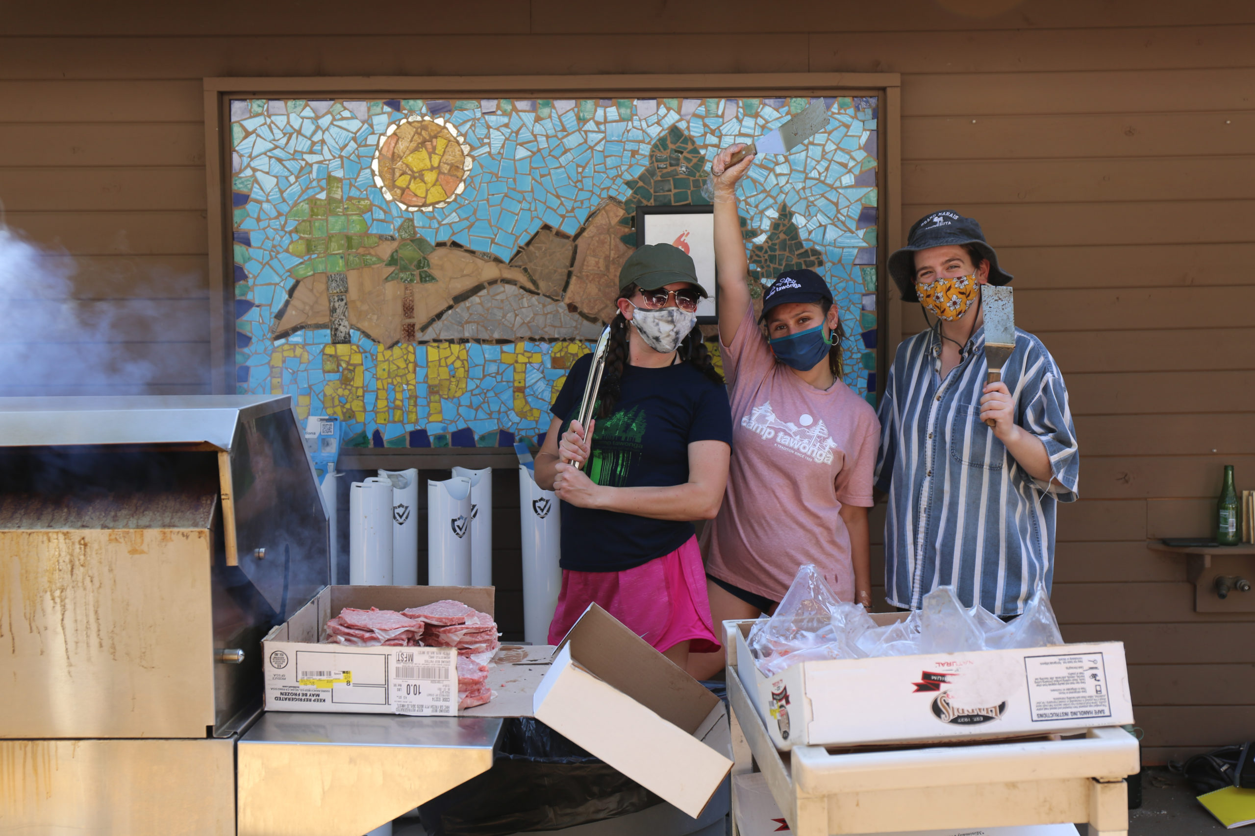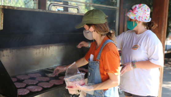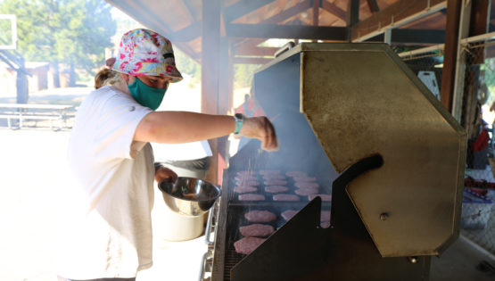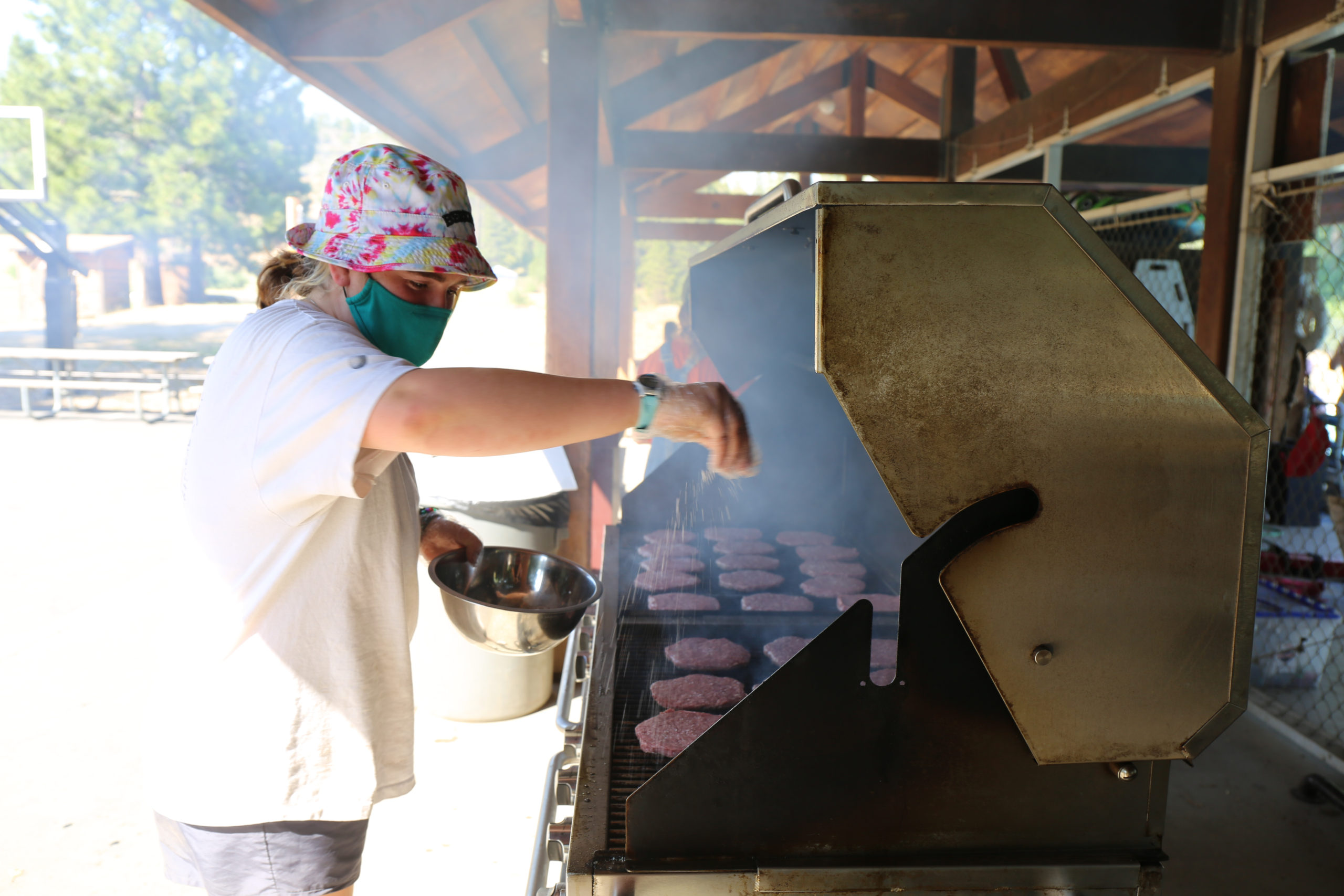 Grill masters! Unit Heads (supervisors of Units which consist of 4-5 bunks) grill hamburgers, hot dogs and chicken for BBQ dinner.