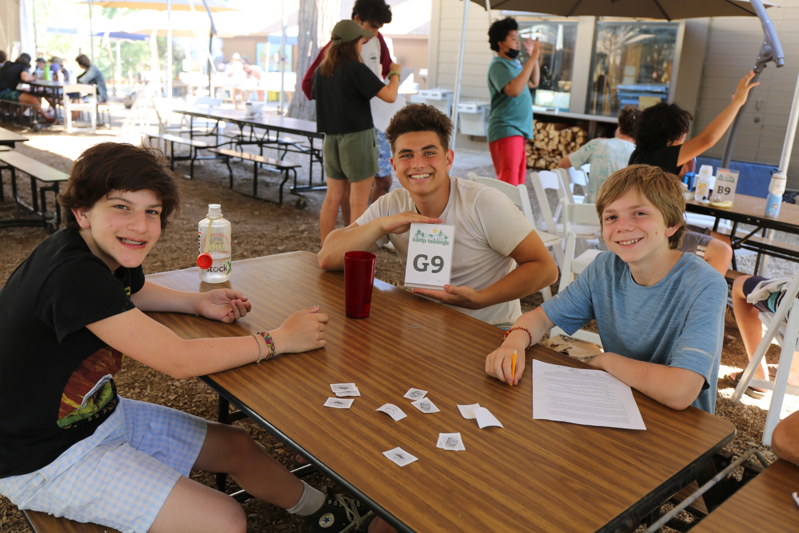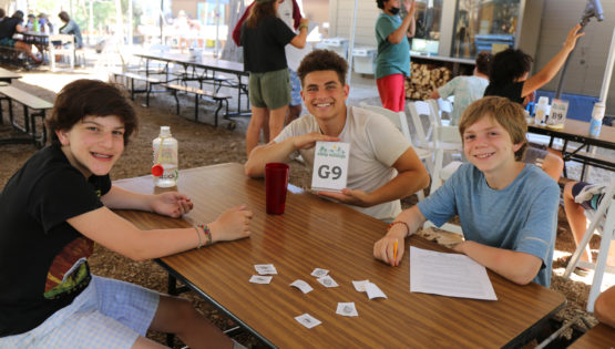 Campers in the dining pavilion spending a portion of their afternoon on a Shabbat program focusing on teamwork and leadership.