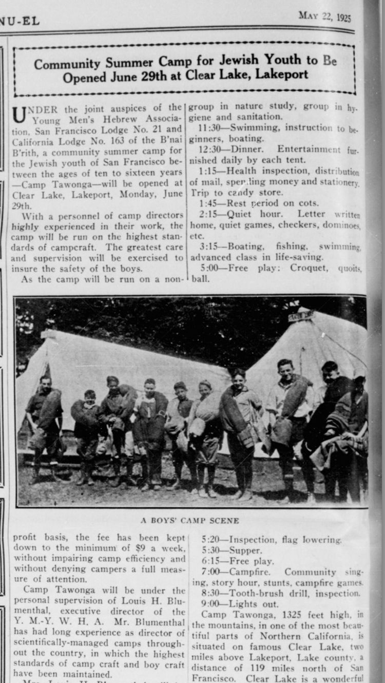 Emma Loewy, an administrator at the San Francisco Young Women's Hebrew Association, became director of the girls’ camp in 1928 and remained in that role into the 1940s. Emma Loewy and Louis Blumenthal married in the early 1930s.