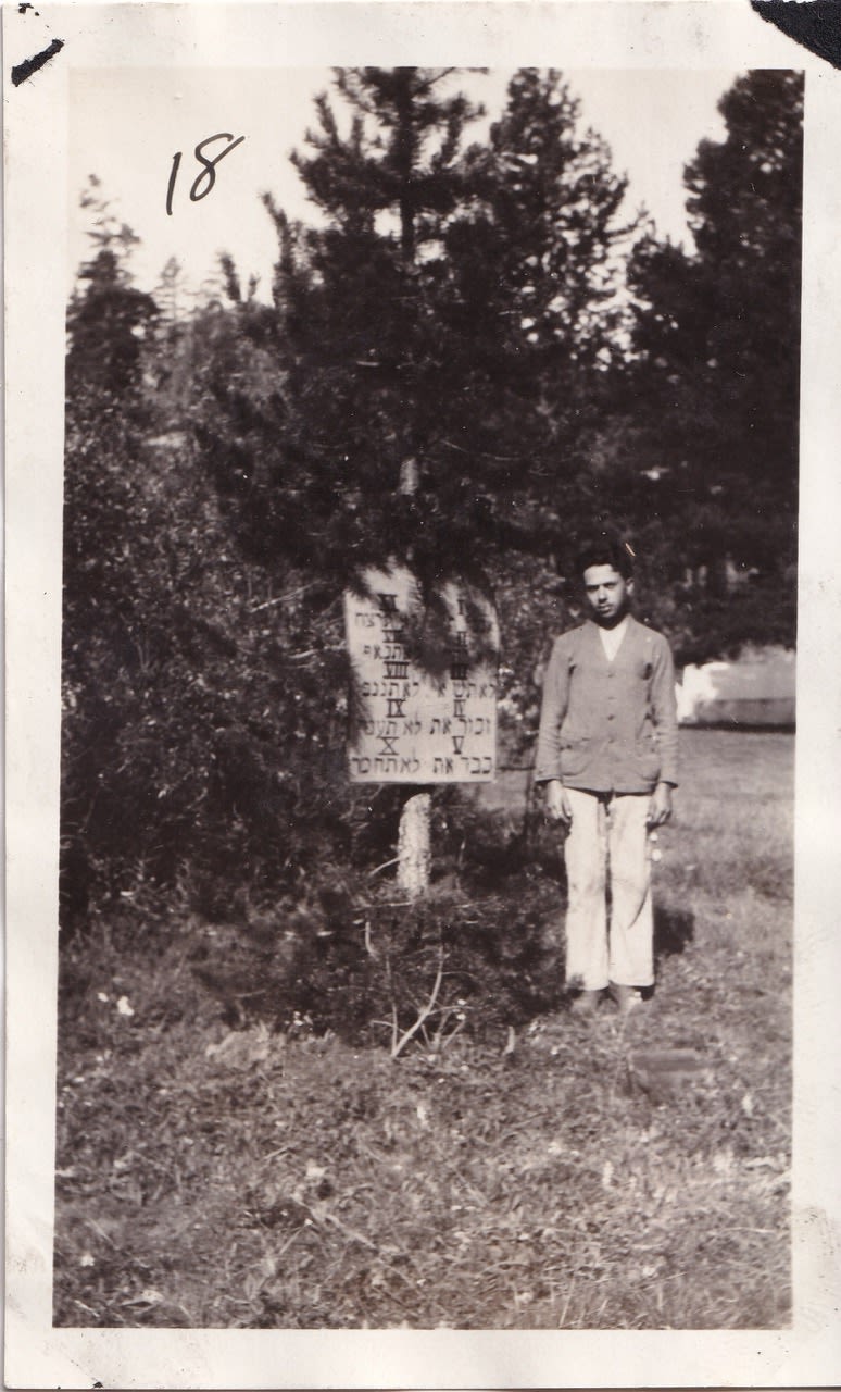 A Tawonga camper (possibly David Greenberg) stands in front of the Ten Commandments, ca. 1927