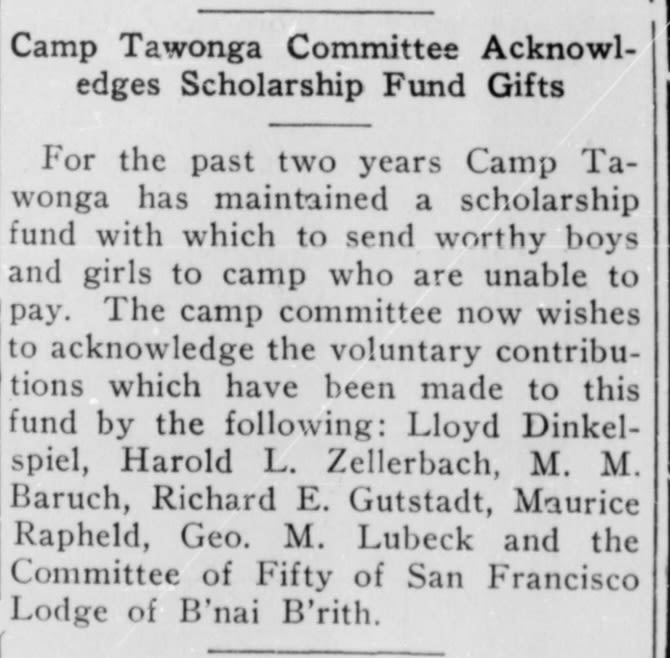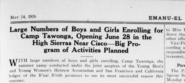 Tawonga's early leaders were mostly members of San Francisco's culturally assimilated German Jewish community. By the 1920s, San Francisco’s leading Jewish families had already established themselves within the city’s civic and business elite — a prominence symbolized by the new Temple Emanu-El building, which laid its cornerstone in the same year the YMHA opened Tawonga.