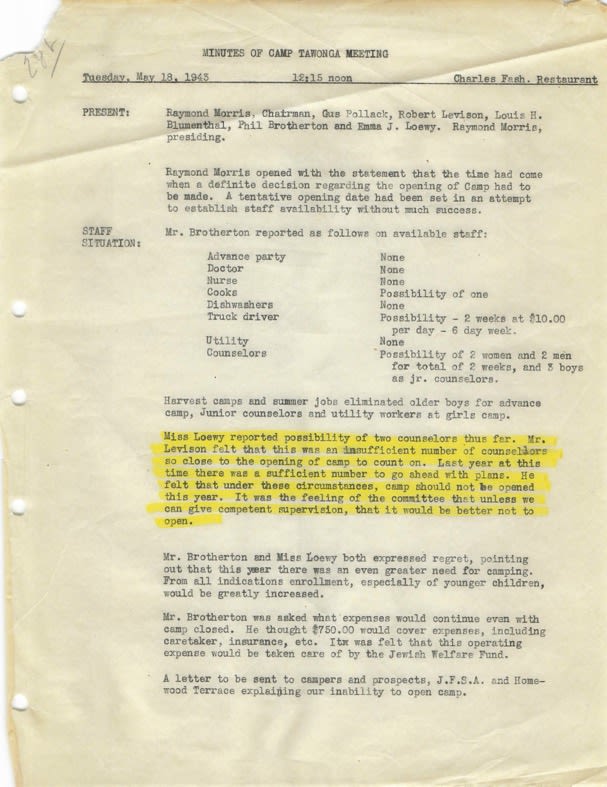 The staffing pressures proved insurmountable. One newspaper later reported that all but two of Tawonga’s counseling staff had departed for military service. In 1943, Tawonga's board of directors reluctantly voted to close the camp. Without income to pay off the property mortgage, they were forced to sell the Meyers site.