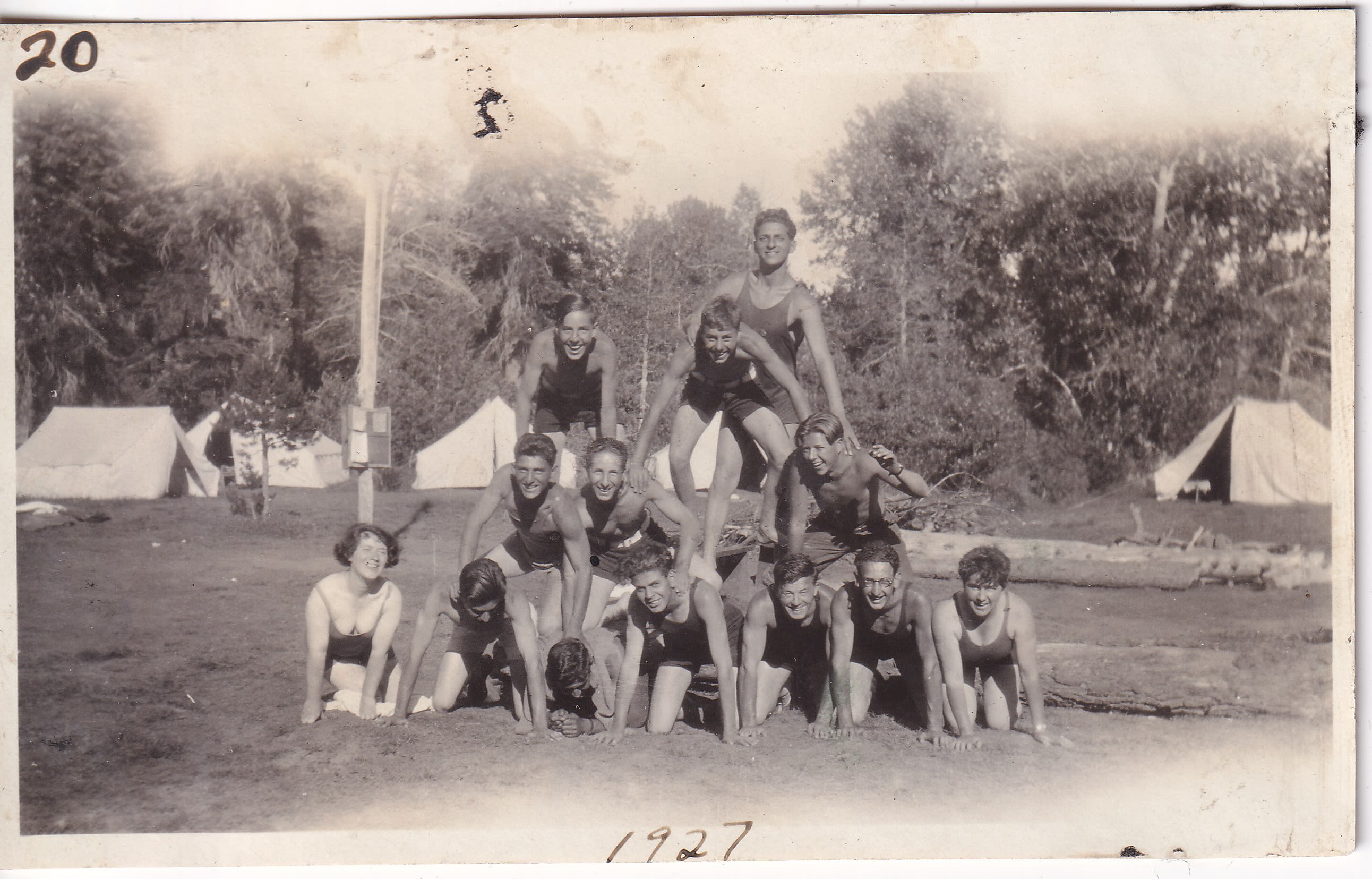 This photograph, labeled "Lakeport, 1925," is from one of Tawonga's early scrapbooks. Lakeport was a town on the other side of the lake from camp's actual location, which was close to the town of Clearlake. On close inspection, evidence in the photo suggests that the attribution of both place and date are wrong. The photo is actually from 1927 when Camp was located near Cisco, Calif.