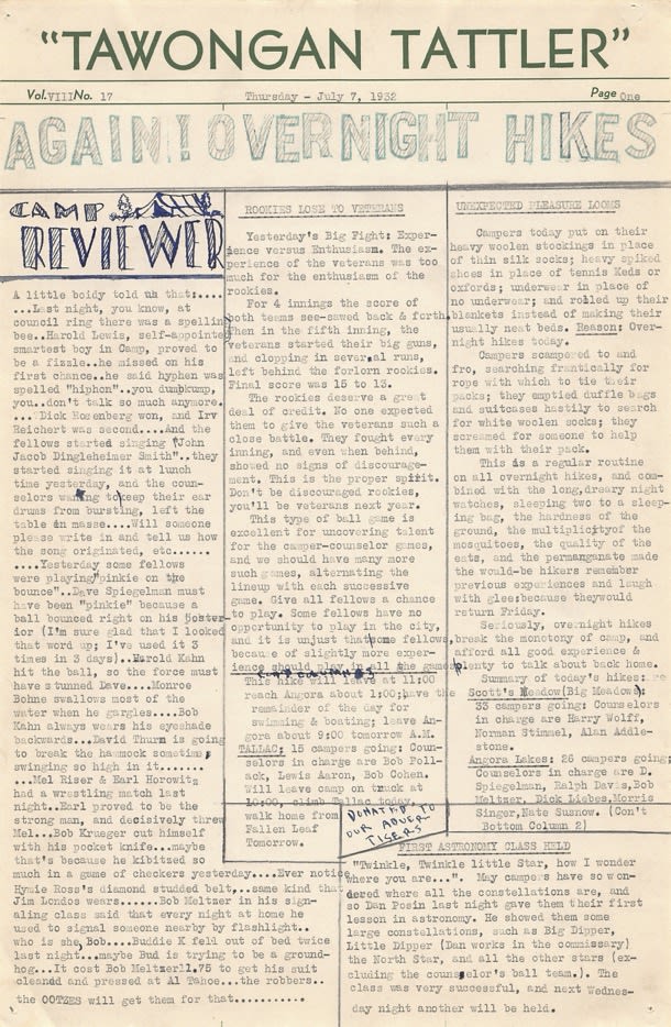 In the 1920s and 1930s, campers at Tawonga also produced a regular typewritten and hand-illustrated newspaper, the Tawongan Tattler. The paper reported on life at camp, its pages full of (now entirely cryptic) in-jokes and nicknames.