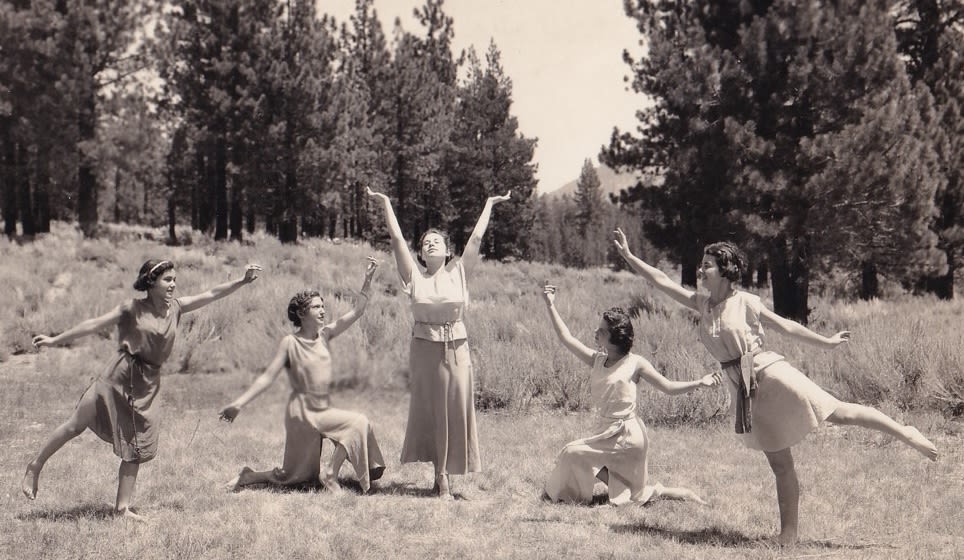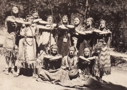 A group of Tawonga women in costumes intended to mimic Native American clothing, ca. 1929