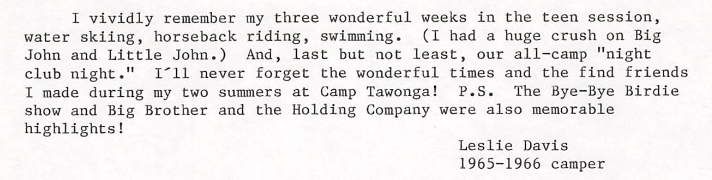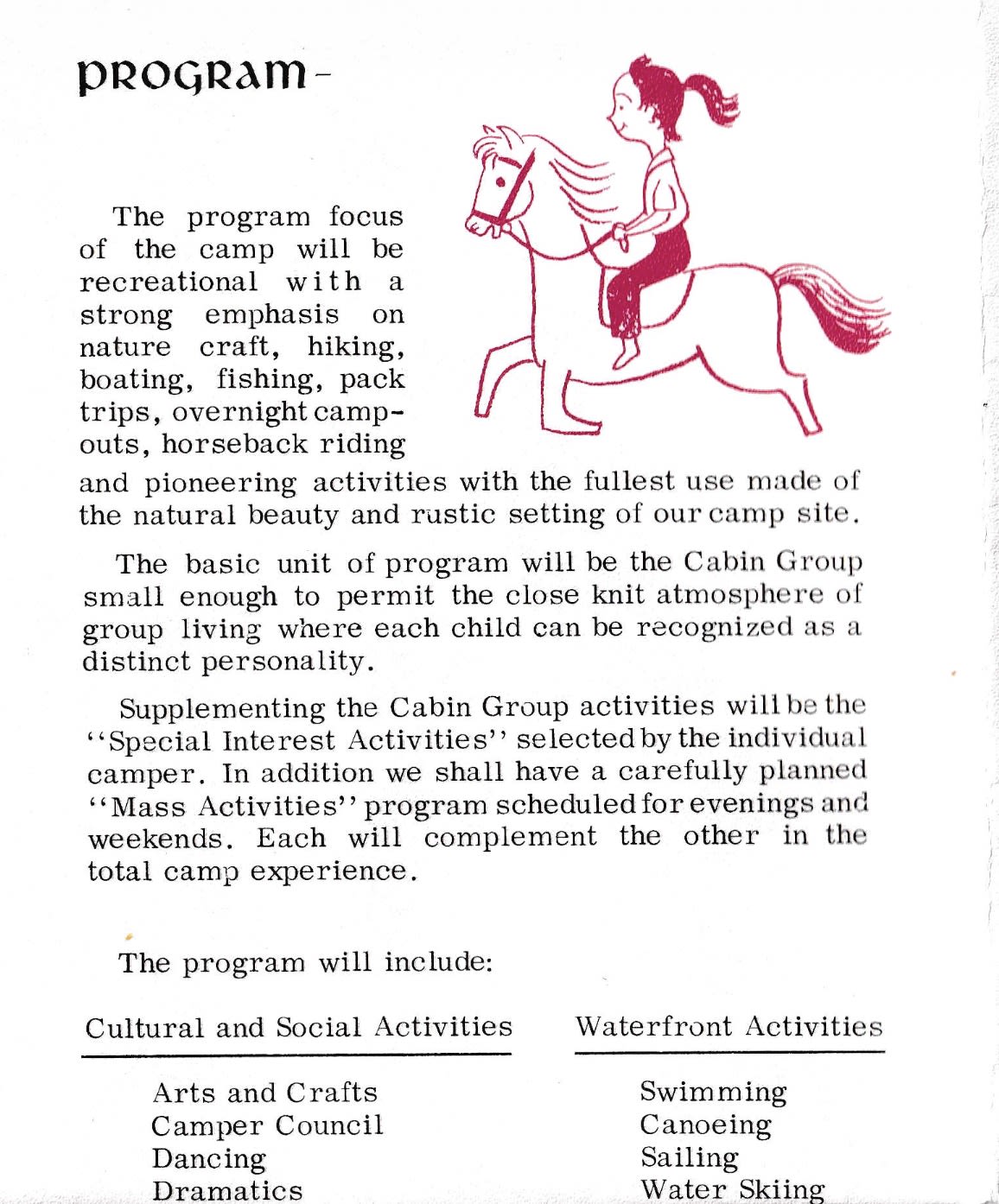 The language was general, almost generic: swimming, horseback riding, crafts, nature. There was no indication yet of what would make Tawonga distinctive. It was a basic summer camp trying to be a summer camp.