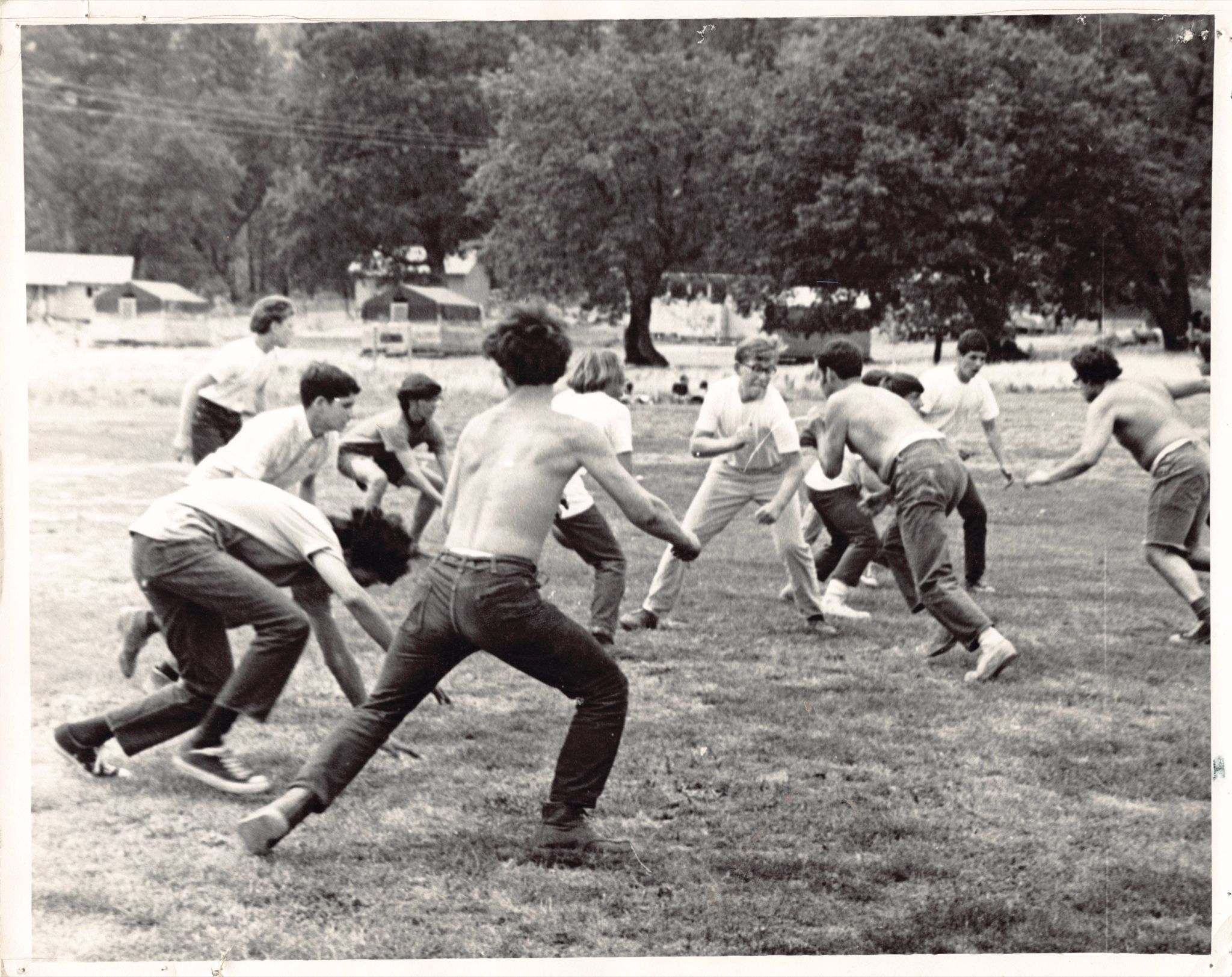 A counselor training session in the center of camp (the area near the stage we now call the Golden Triangle), likely 1966 or 1967.