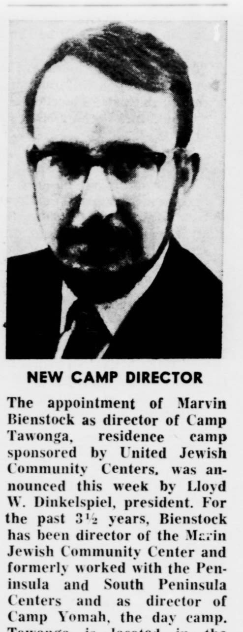 In 1967, the UJCC appointed Marvin Bienstock as camp director. Bienstock, who had been leading the Marin Jewish Community Center, brought a distinct sensibility to Tawonga.