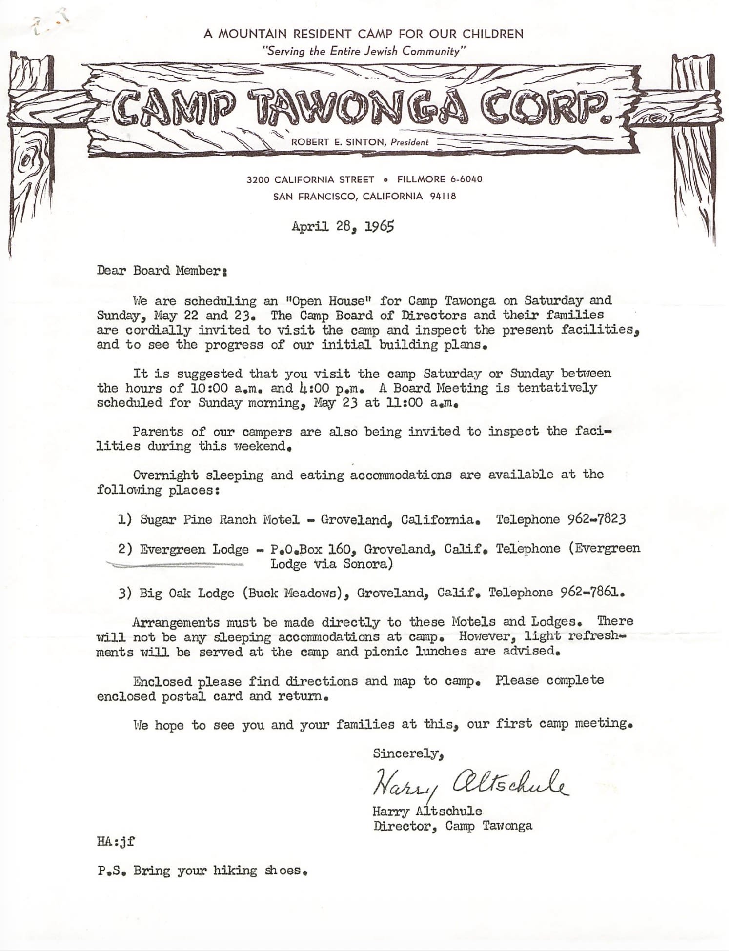 The letter below, from Altschule to the board in spring 1965, invites them to an “Open House” on the property several months before camp opened to campers that summer.