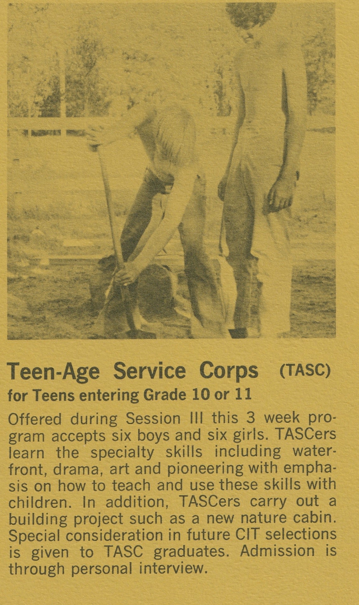 Bienstock was especially focused on building Tawonga's teen program. In 1969, he launched the Teen-Age Service Corps (TASC), a program that gave older campers the chance to work alongside activity specialists while also contributing to camp infrastructure.