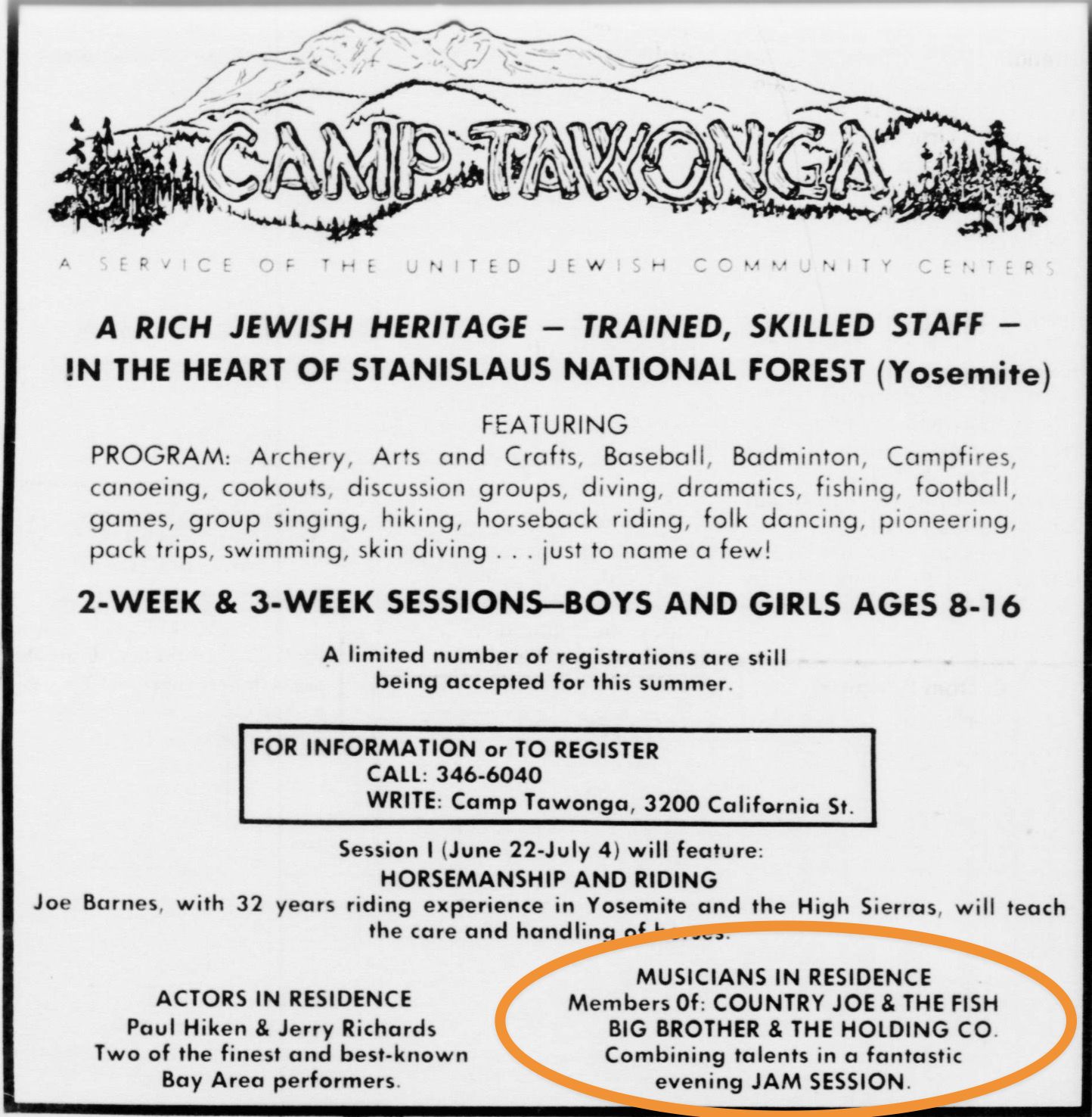 Tawonga ran an advertisement in the Jewish Community Bulletin, May 30, 1969, describing Big Brother and The Holding Company as “Musicians in Residence.” However, Joplin had left the band in 1968, so this was not the summer of her appearance at camp.