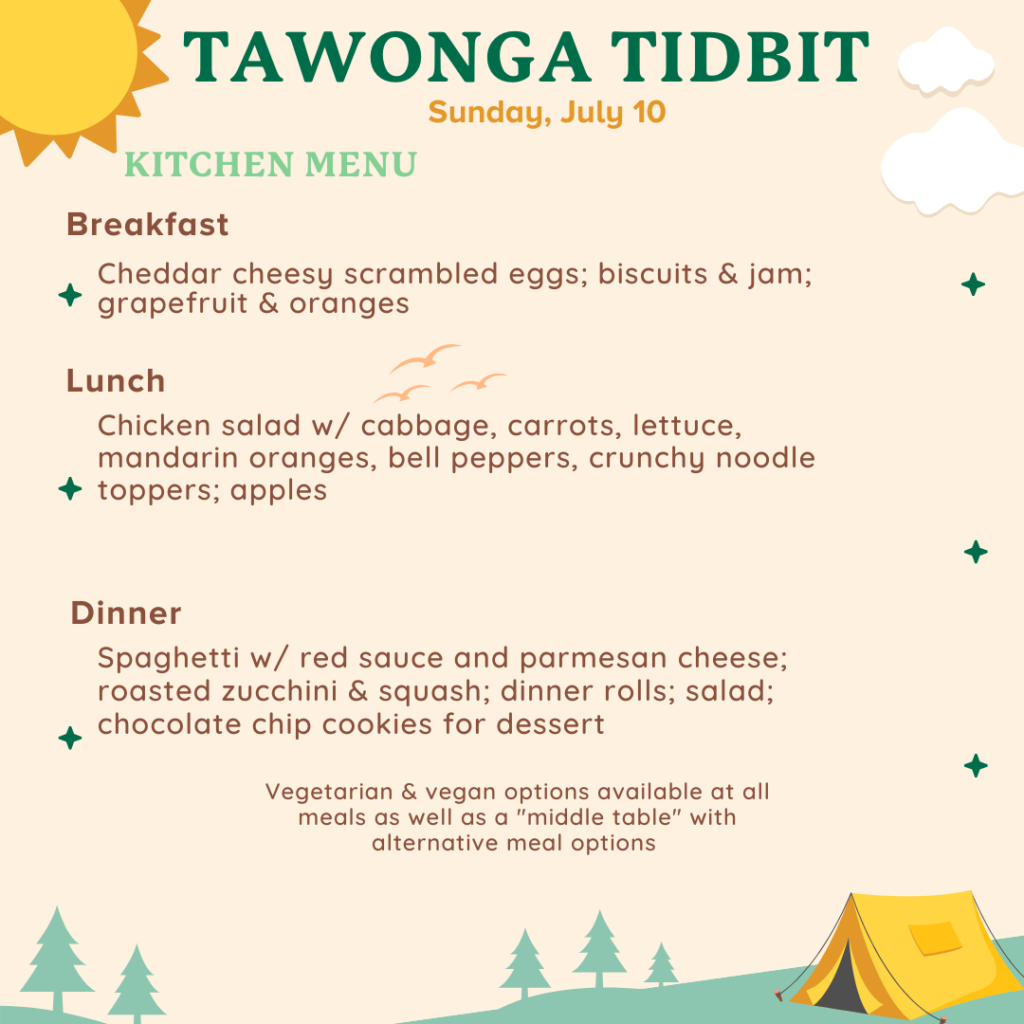 At Tawonga, we strive to make mealtime an enjoyable, connecting and community focused experience. Our kitchen staff prepares nutritious and delicious meals, as well as alternative options to accommodate food allergies, restrictions and preferences. Prior to attending Camp, families complete camper information forms which include detailed questionnaires about each child’s unique dietary needs.