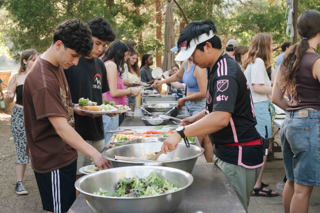In Tawonga’s state-of-the-art kitchen, our dedicated team of kitchen staff prepare family-style meals for our 600-person community three times a day. They cook from scratch to provide healthy and delicious meals and snacks. Meals are balanced, using locally sourced and organic ingredients whenever possible, including from Tawonga’s own garden. Whether at Camp or on the road, our food is “kosher-style,” meaning we never mix meat or dairy, nor do we buy or serve non-kosher foods such as pork or shellfish. However, we do not have a kosher kitchen and do not serve exclusively kosher meat and chicken (except at Shabbat dinner). Check out the Tawonga blog for Tawonga Tidbits to explore some daily menus from the kitchen during the summer.
