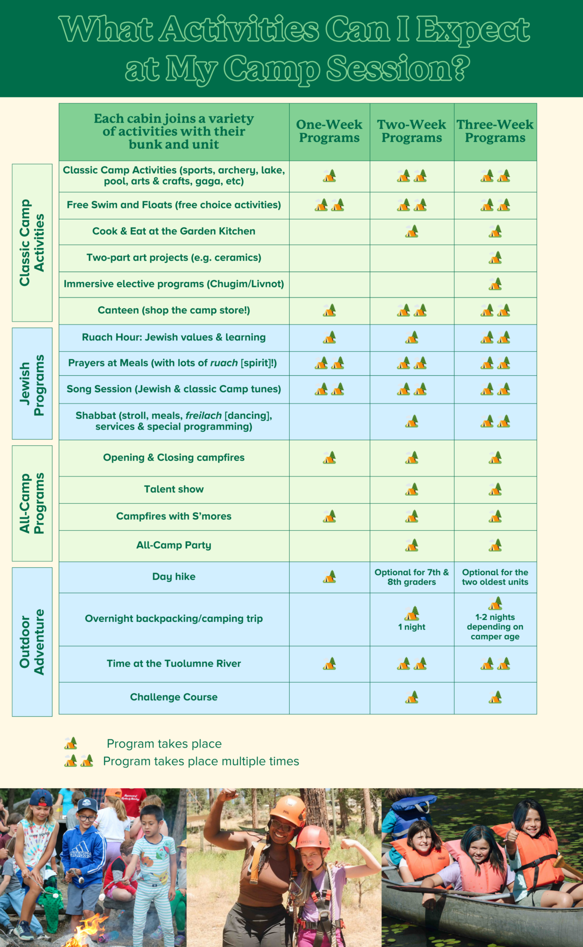 Sessions 2, 2a, 3, 3a and 4 feature all of the classic camp activities, Shabbat celebrations, 1-2 night backpacking trips (or camping trips for the youngest campers), optional day hikes, a day on the adventure challenge course, elective activities and more and are the perfect blend of fun, friendship and independence. These longer sessions maximize safety by minimizing camper population turnover and offer campers a chance to build a deep connection to community, nature and Judaism within a warm, welcoming and inclusive environment.