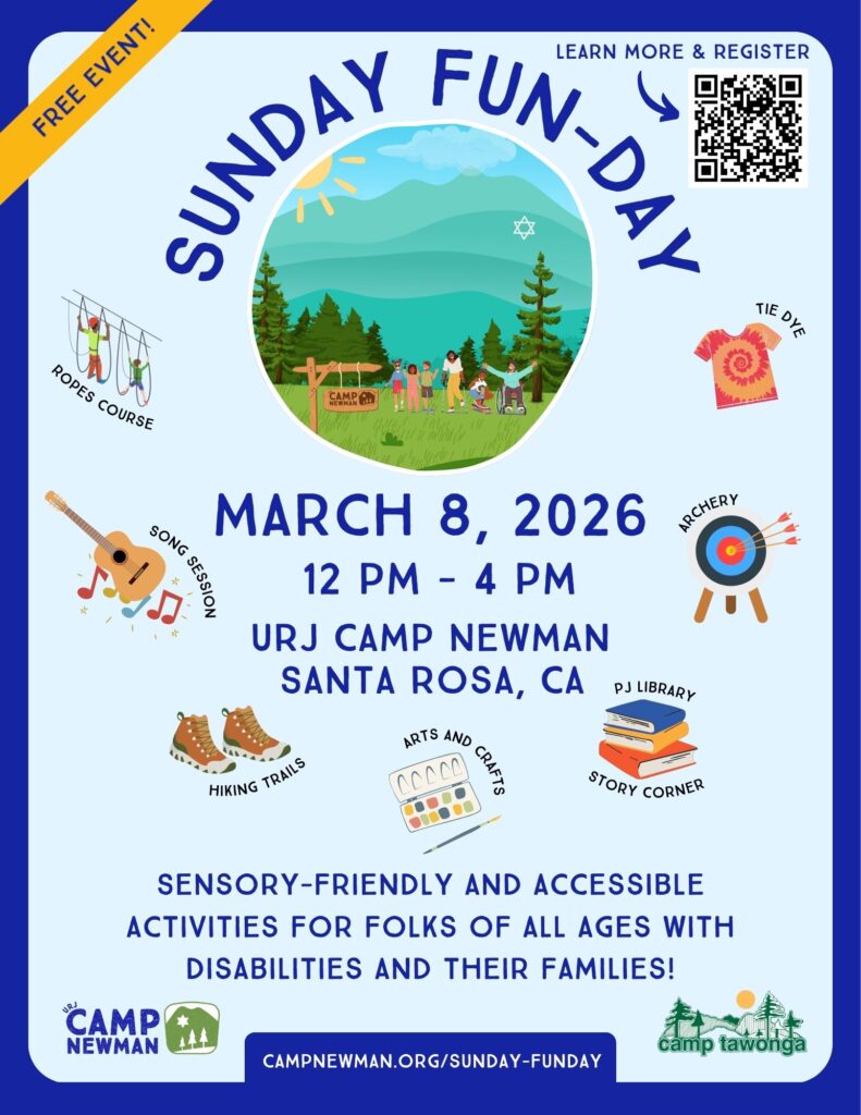 This free event includes sensory-friendly and accessible camp activities like tie dye, s’mores, music, archery, parent discussions, PJ Library Story Corner, and art! Families can also explore Camp Newman’s ropes course and hiking trails. Lunch will be available for purchase or feel free to bring a picnic lunch.