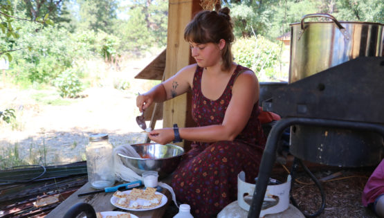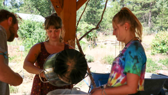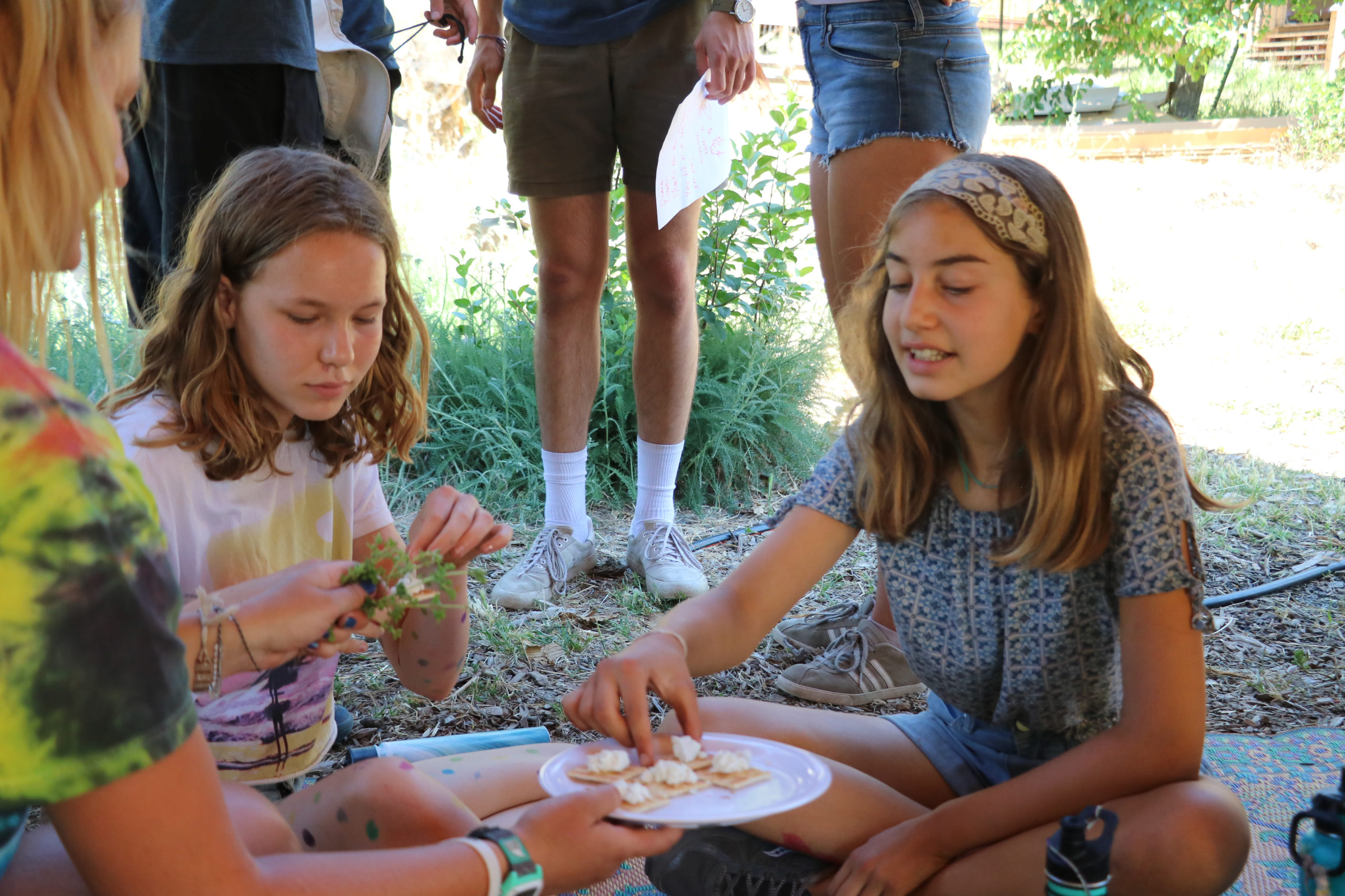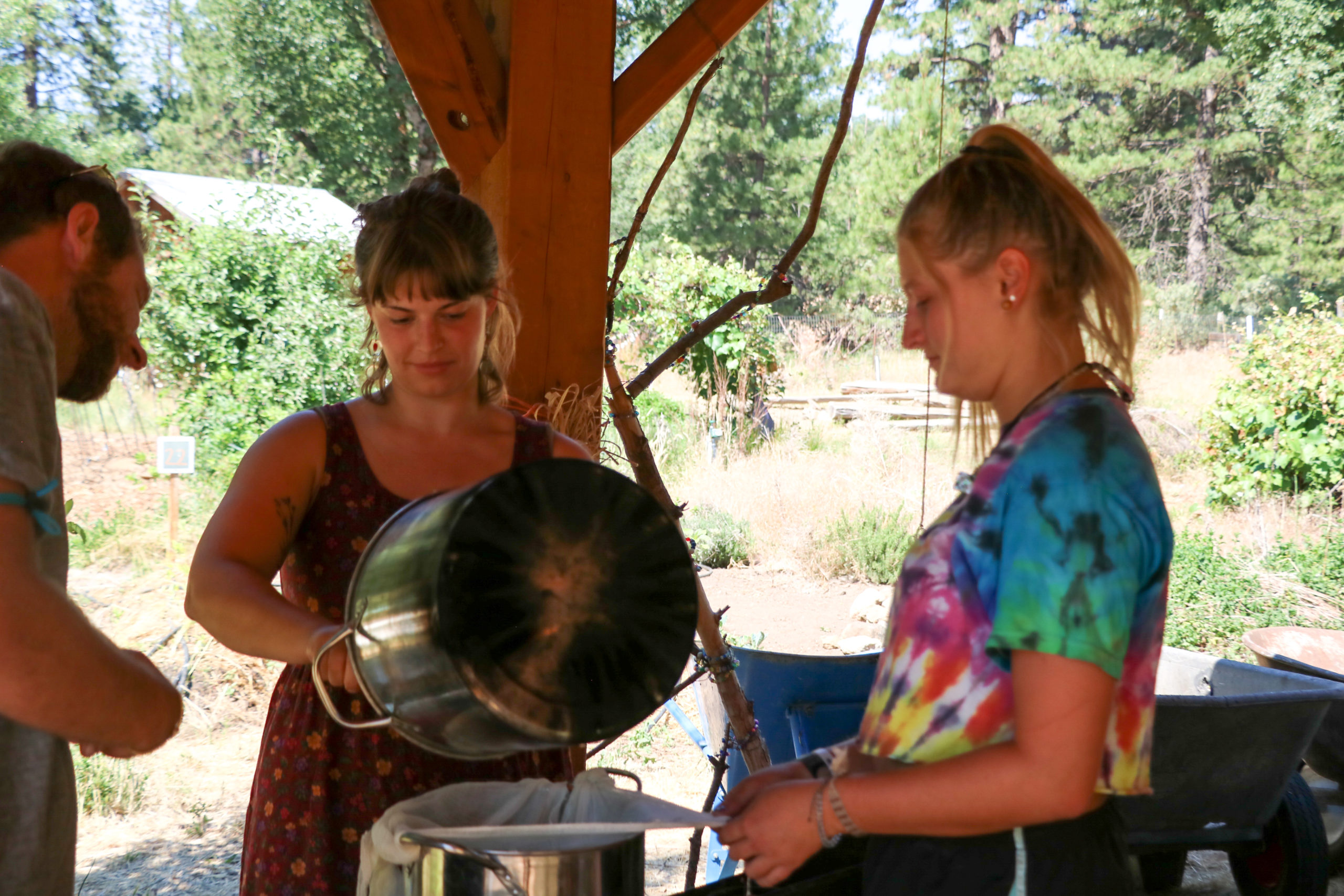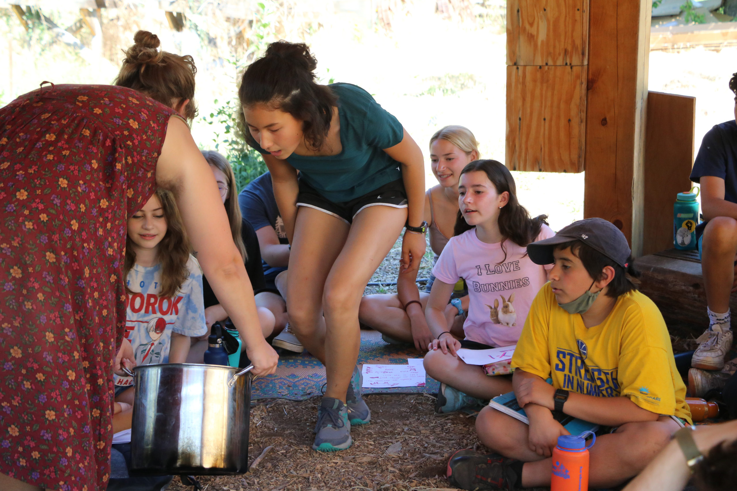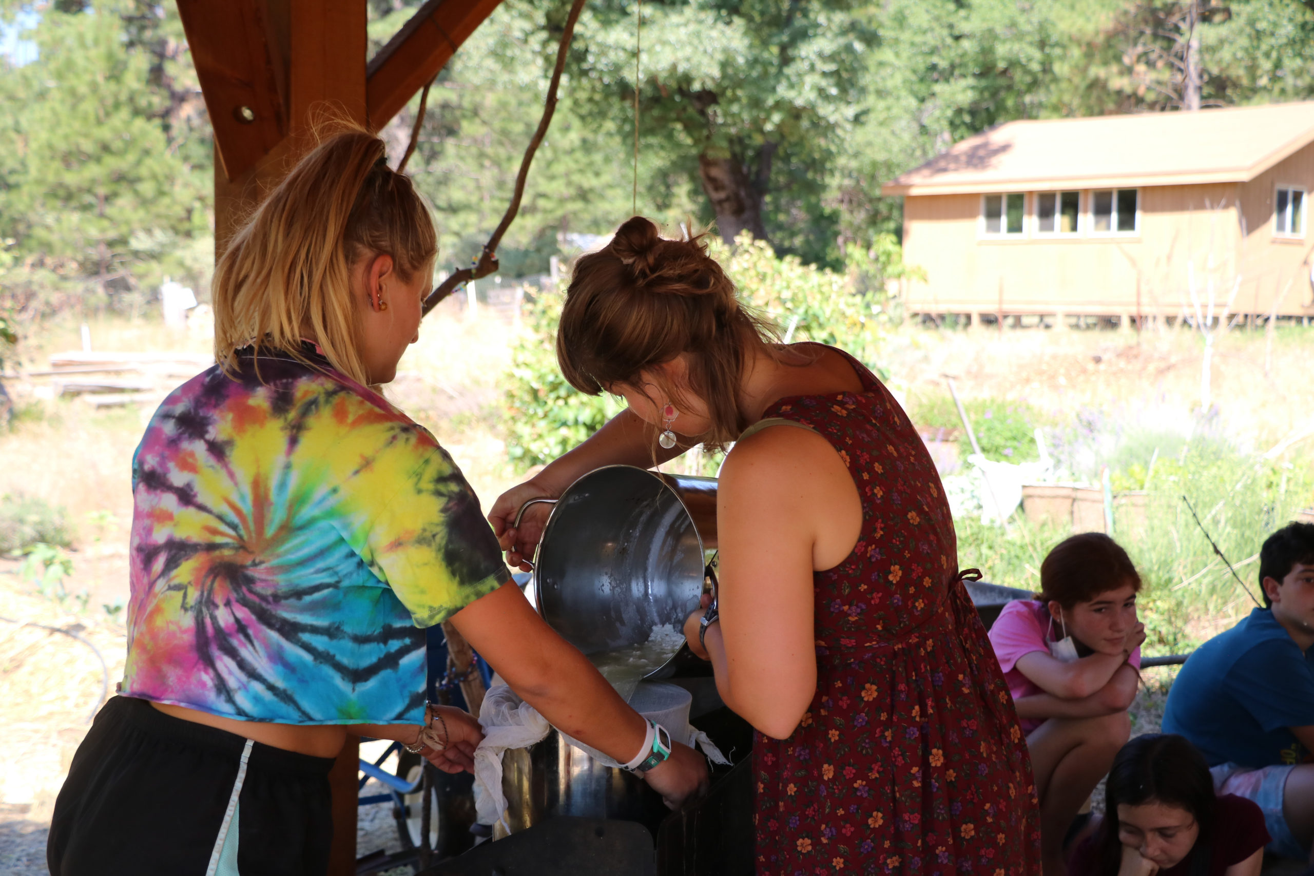 Campers in G-6 and B-8 look at freshly-milked goat milk during their goat cheese making block in the garden