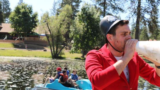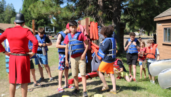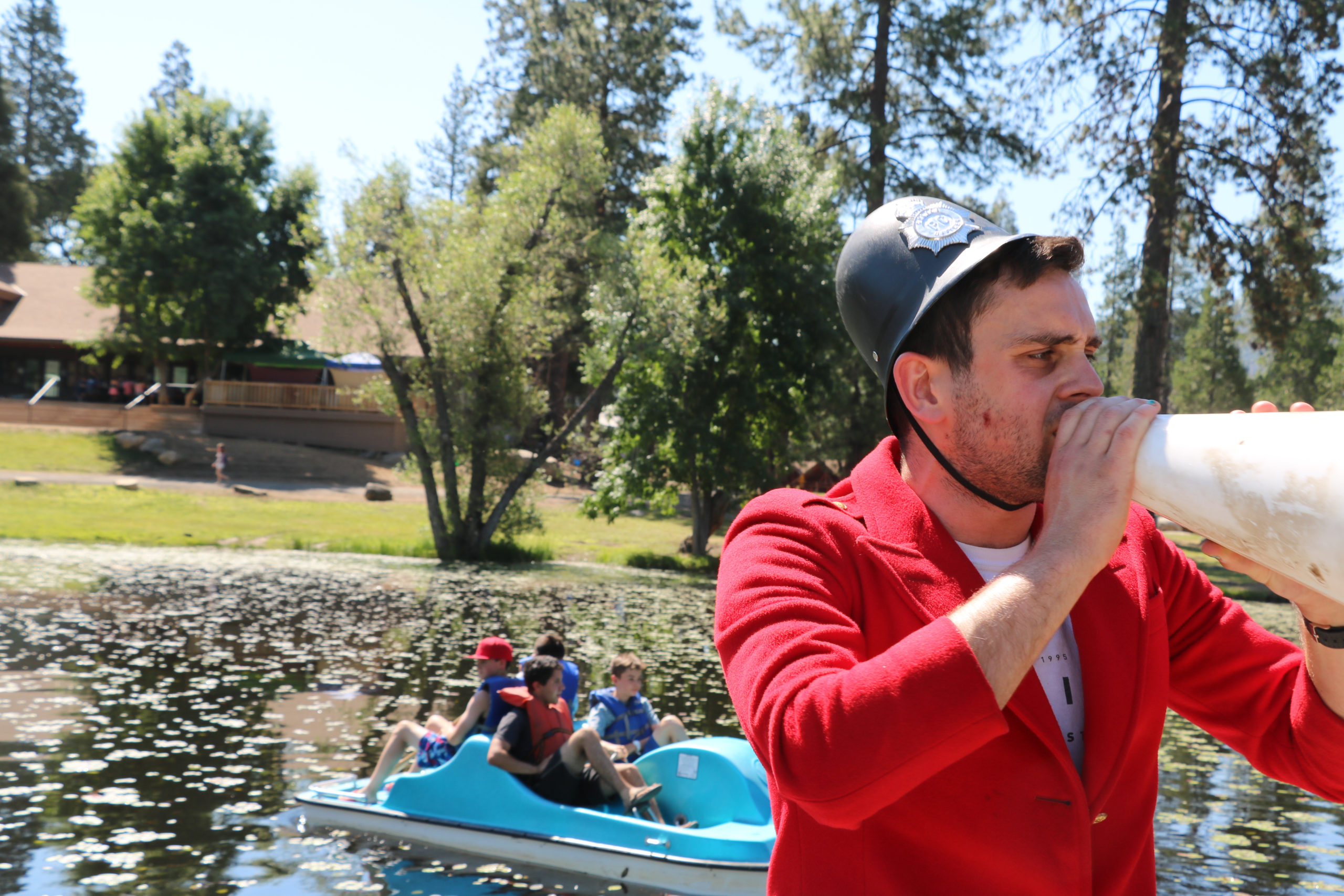 Program specialist, Aaron, yelling "the British are coming," while campers are taking their positions on the lake