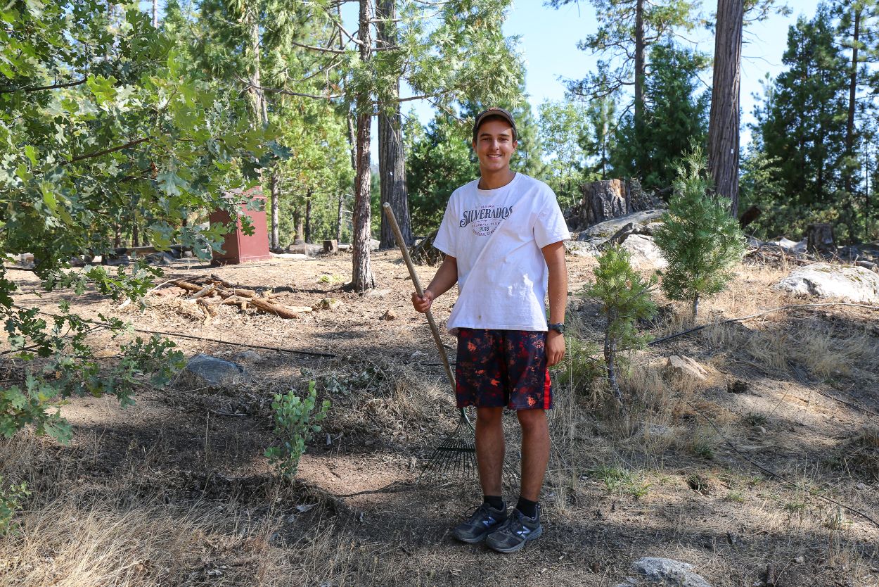 TLI tikkuning (reparing) Freedom Forest by raking paths, lining them with rocks and making beautiful plaques to hang around the campfire area