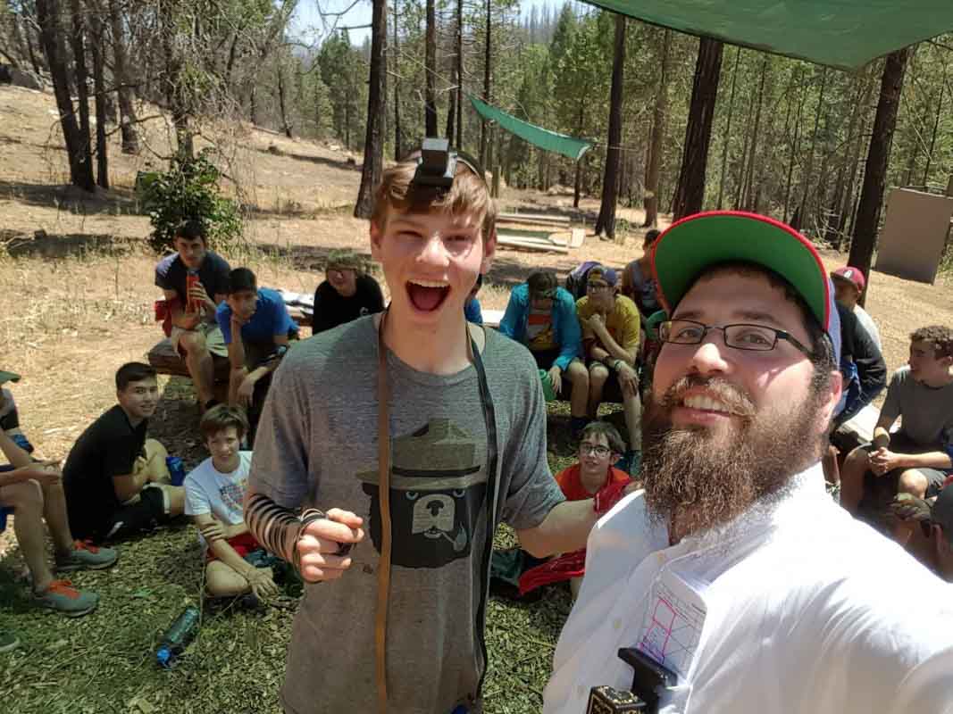 Visiting Rabbi Nosson Potash of Chabad Noe Valley, showing campers how to wrap tefillin