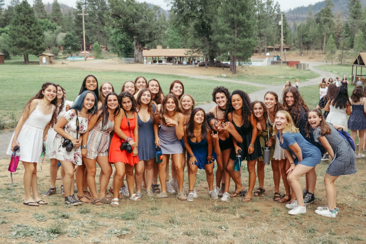 At Camp Tawonga, Friday is not like any other day of the week. All of our bunks return from backpacking trips and day hikes so everyone is together in camp. All normal activities end after 3:45 P.M. when campers are given time to get cleaned up and ready for Shabbat dinner. At 5:30 P.M. our Songleaders will gather outside our Dining Hall with a handful of campers and staff to begin our traditional Shabbat Stroll with Tawonga’s Torah around the property. The Stroll winds its way through the girls’ side of Camp, collecting cabins as it passes by. During this time cabins will gather together dressed in their Shabbat best to take a quick group photo or two before joining the Stroll. The Stroll will then pass through to the boys side of Camp and ends back at the Dining Hall. Before being let into the Dining Hall to enjoy a delicious Shabbat dinner, campers and staff alike have time to wish each other “Shabbat Shalom” and exchange hugs and photos. Once inside the dining hall, all of Camp participates in the traditional blessings for the candles, grape juice and challah before digging in to a delicious meal followed by singing, dancing and Kabbalat Shabbat services.