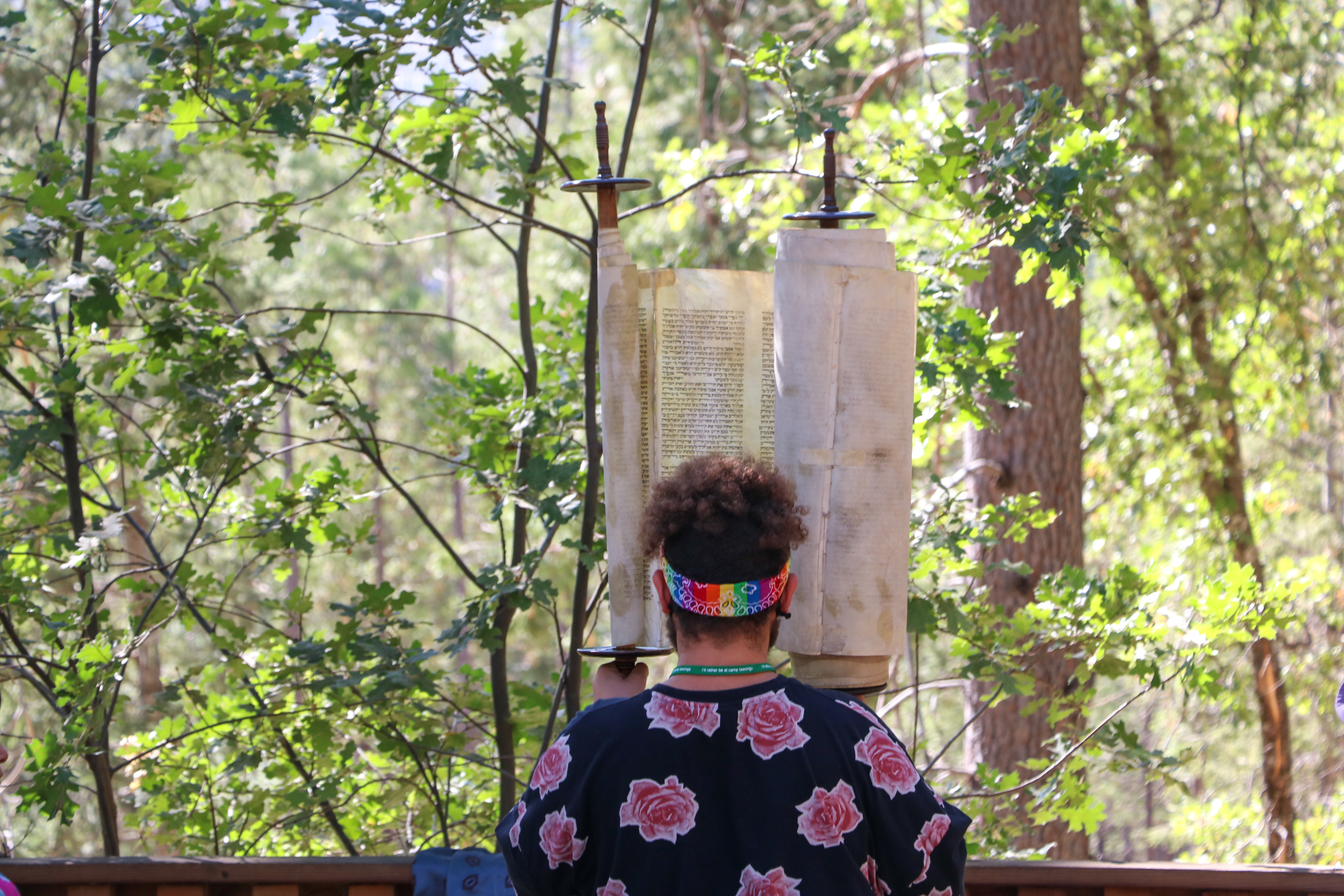 Jordan Daniels holding the Torah during Tawonga's Jewish Families of Color Weekend