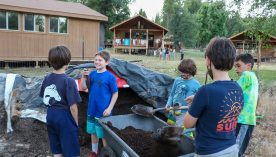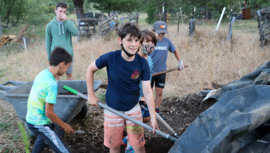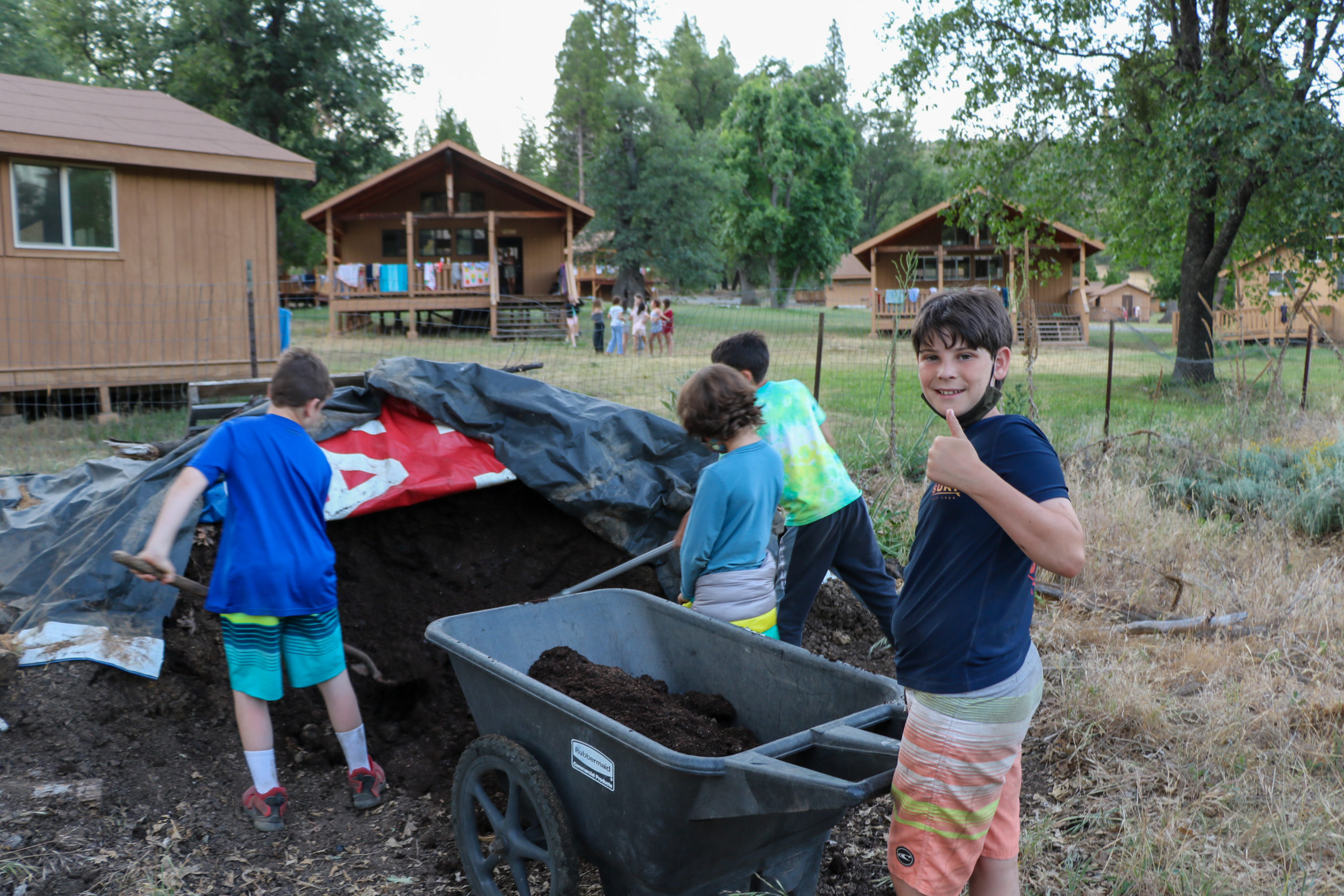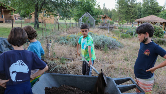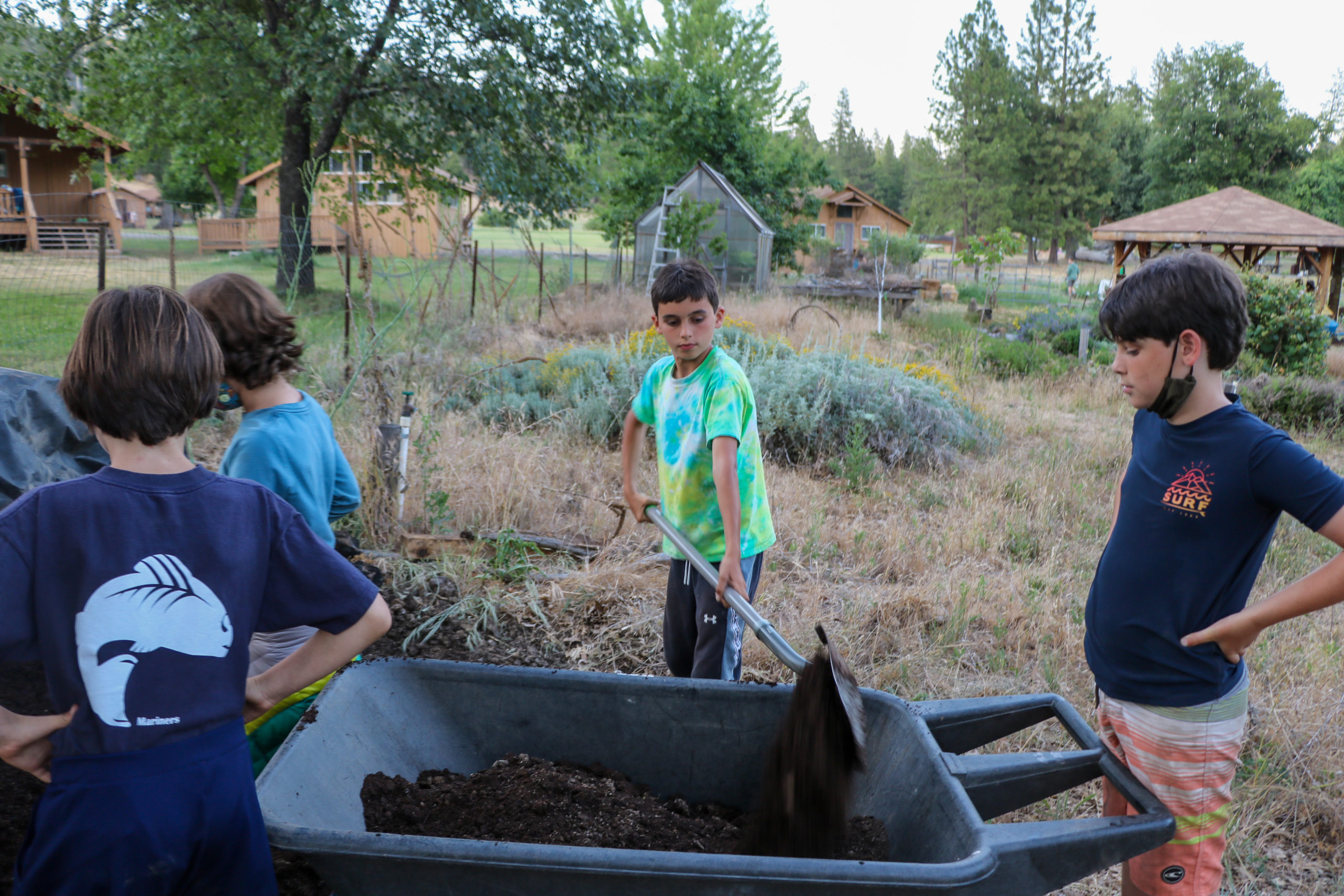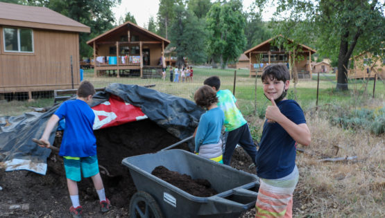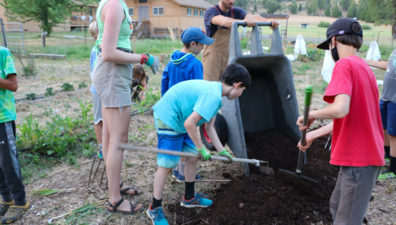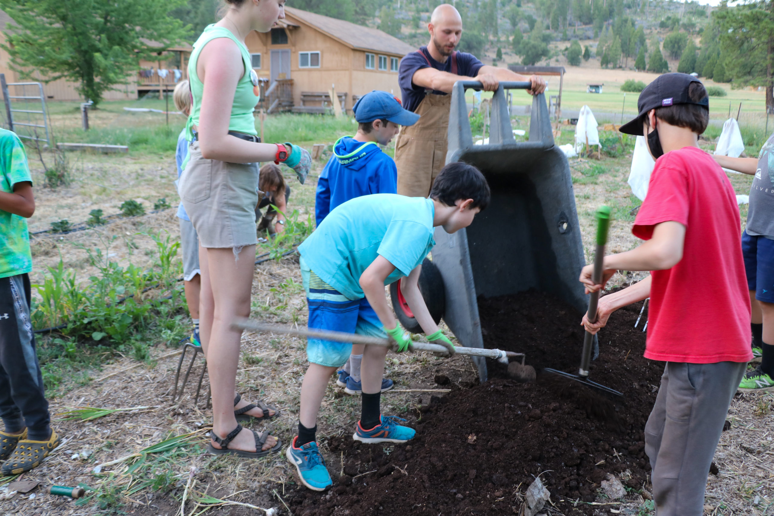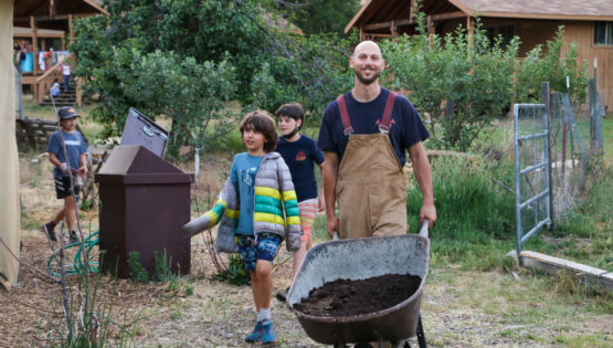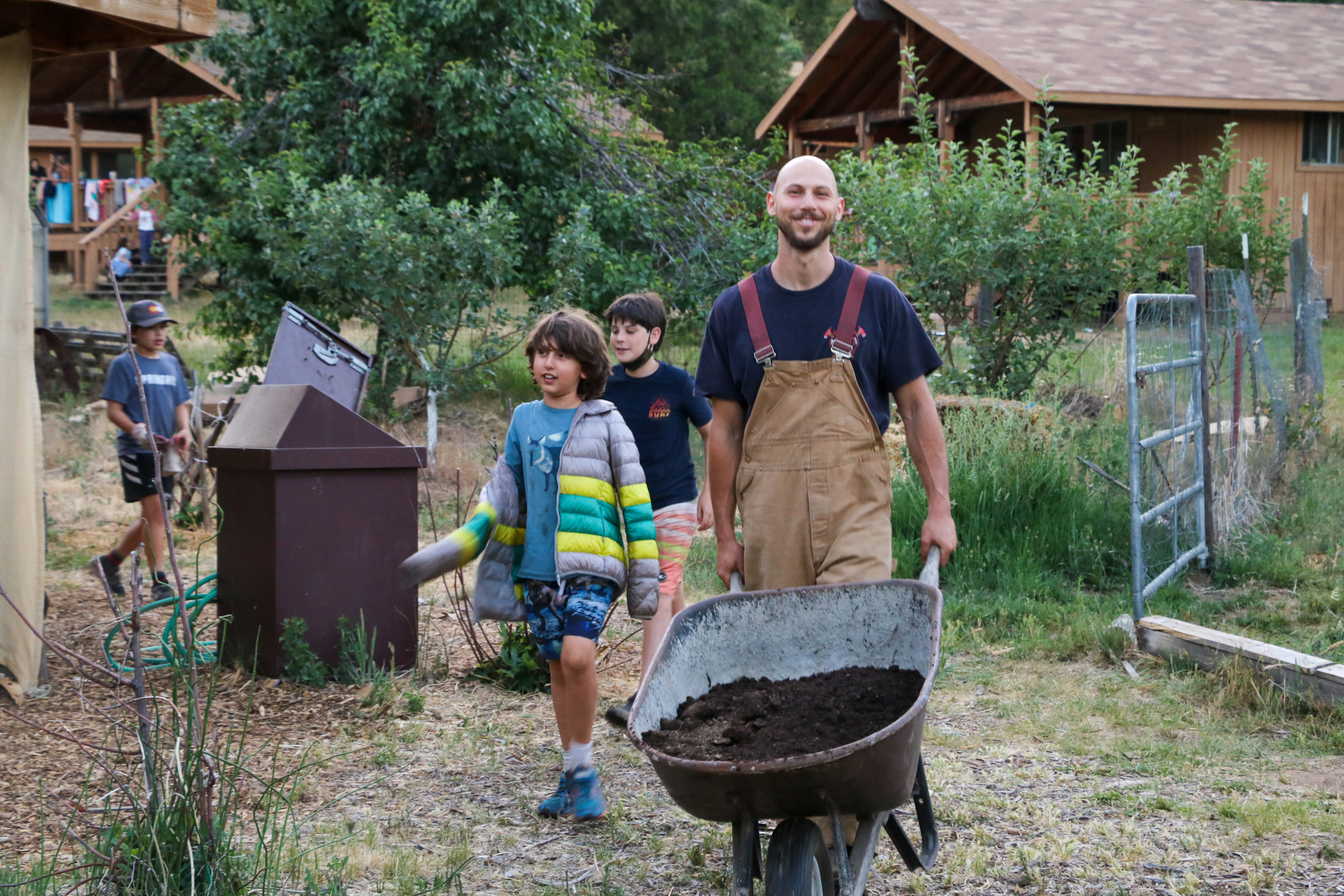 Garden specialist Ben wheelbarrowing dirt for the campers to shovel