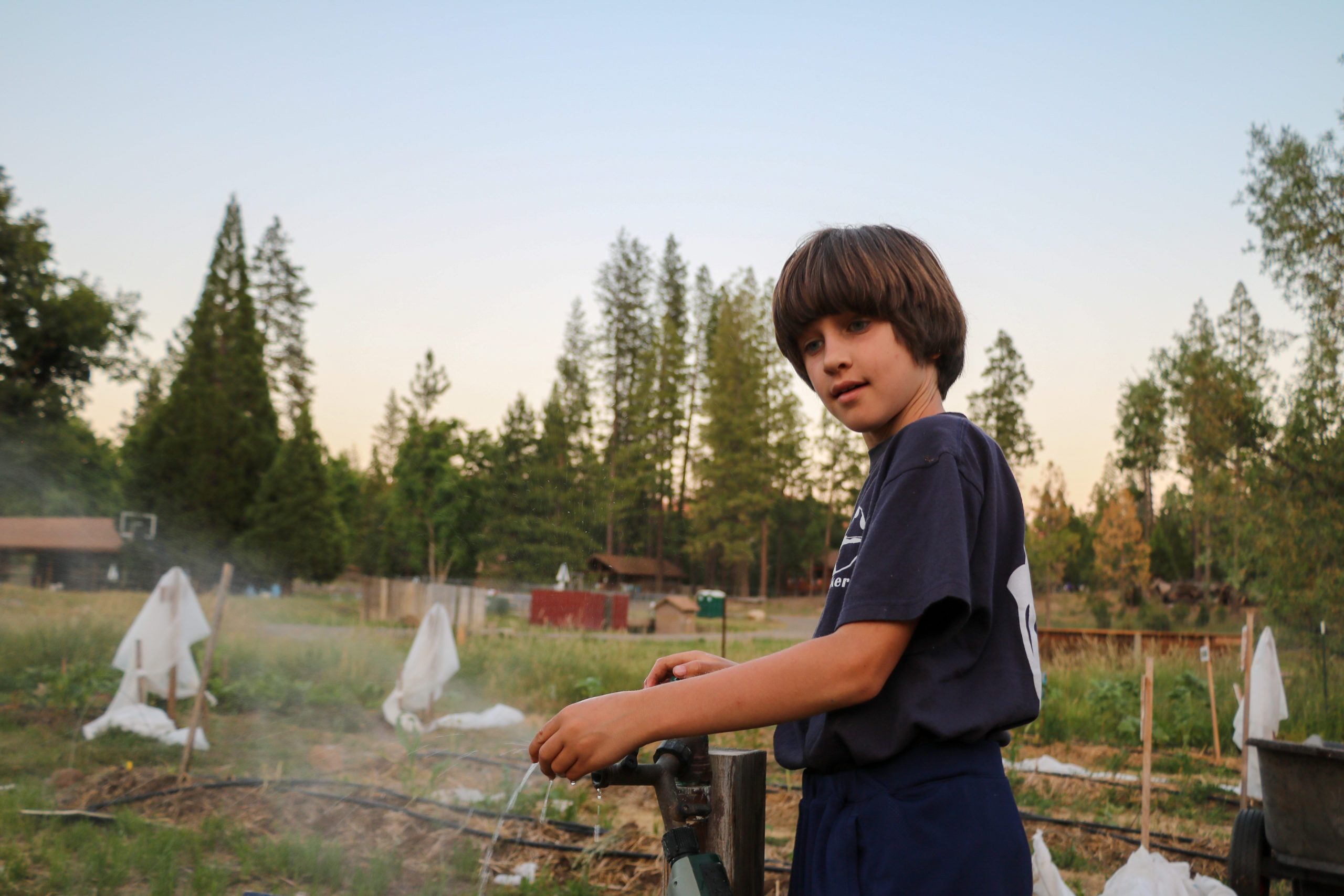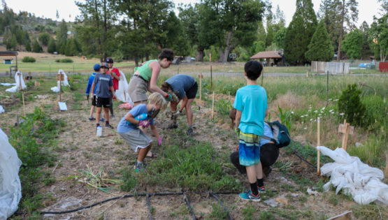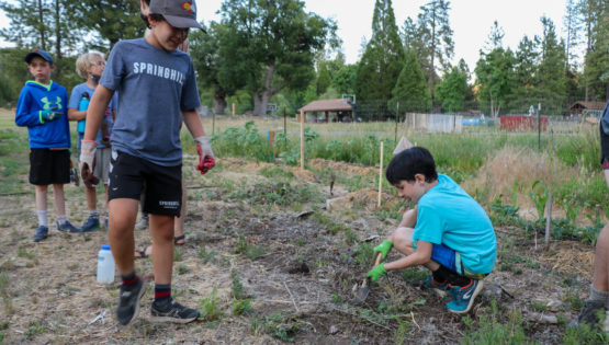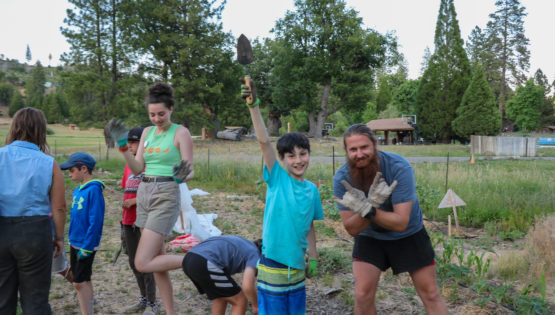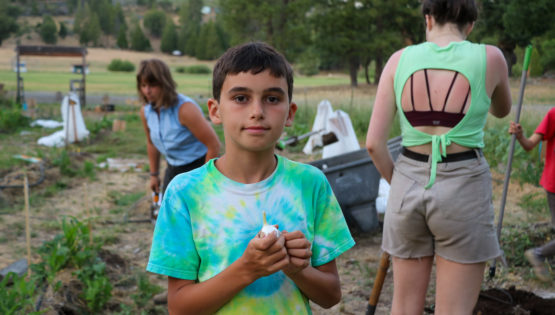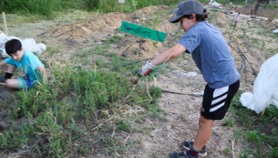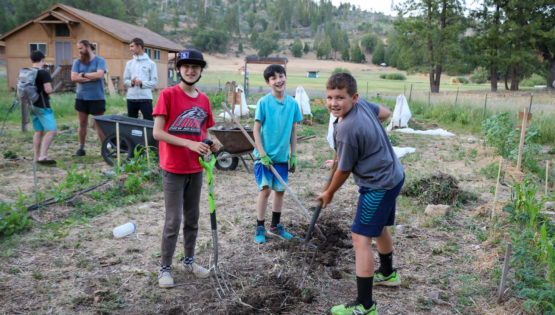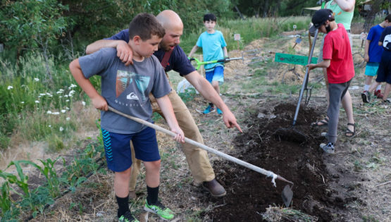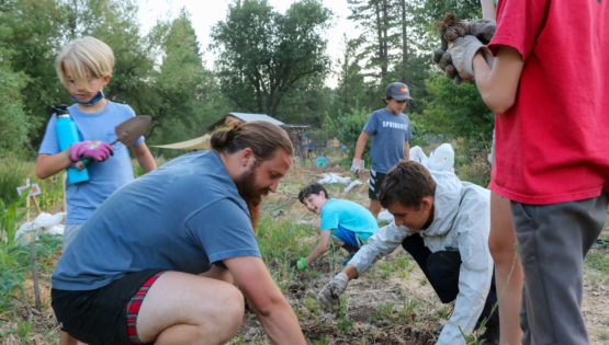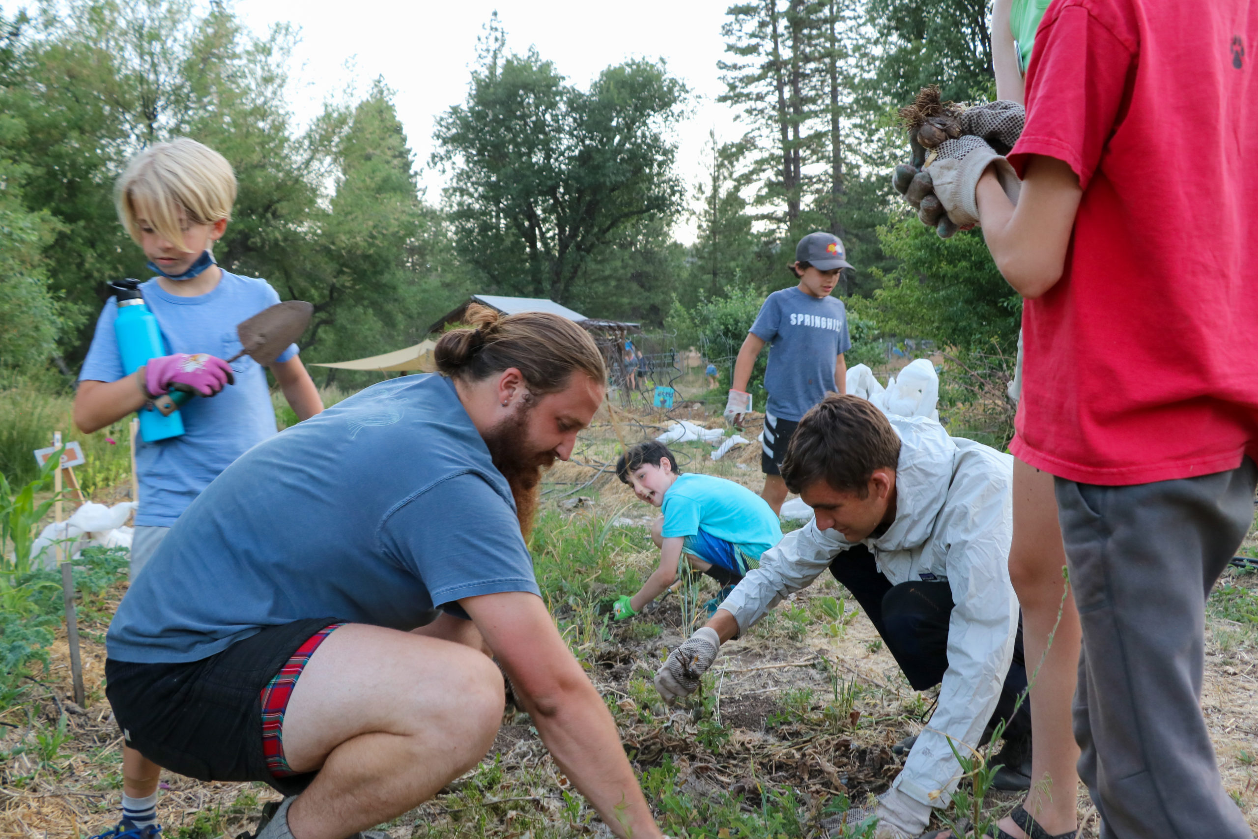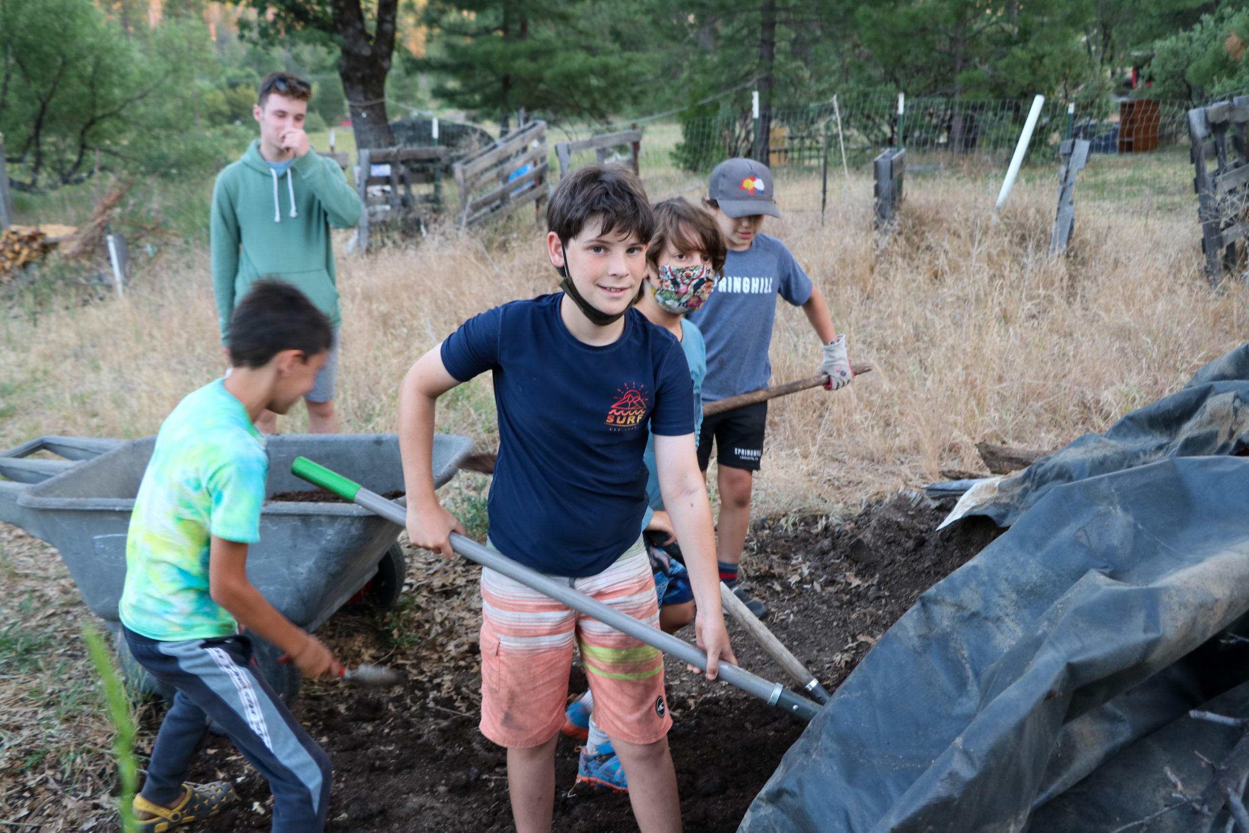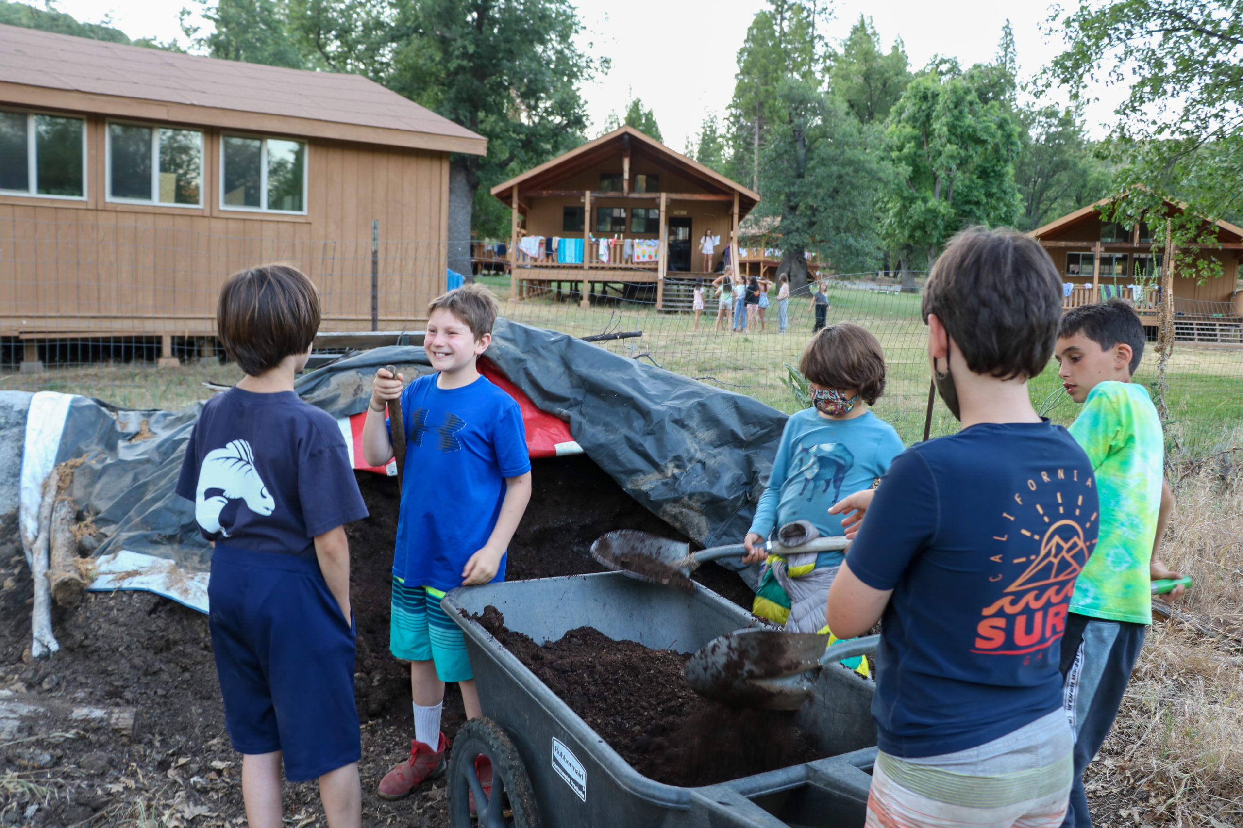 Garden specialist Ben wheelbarrowing dirt for the campers to shovel