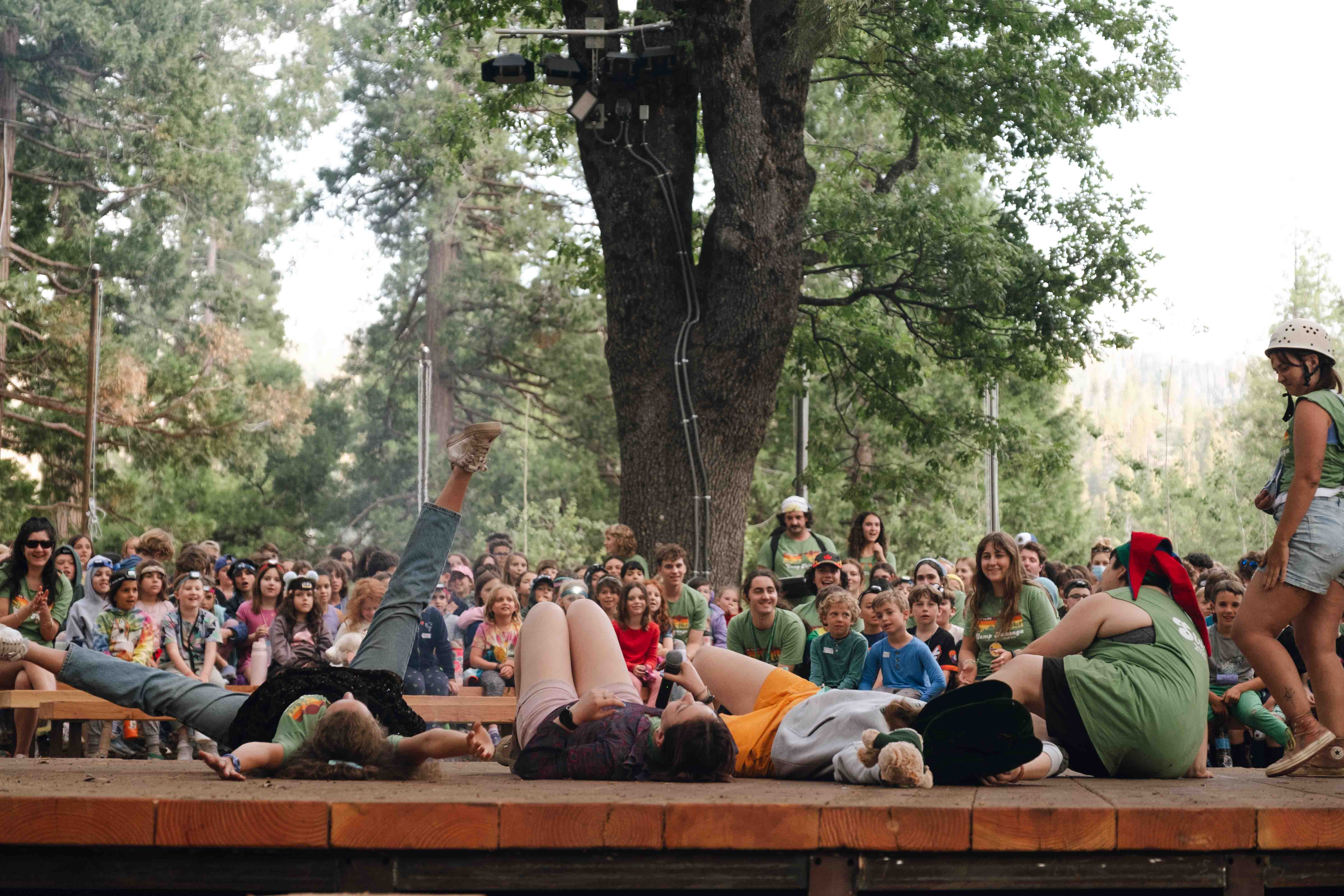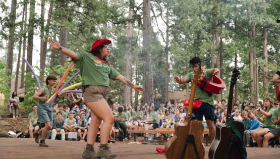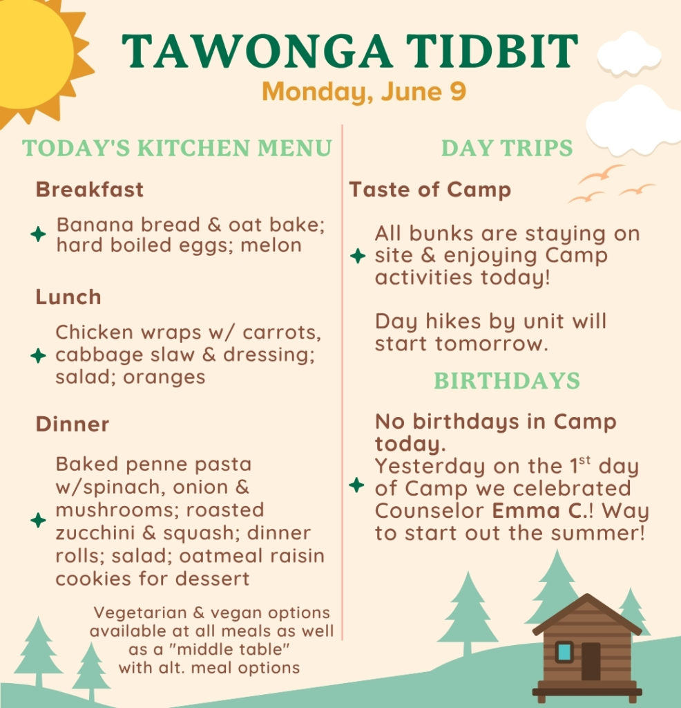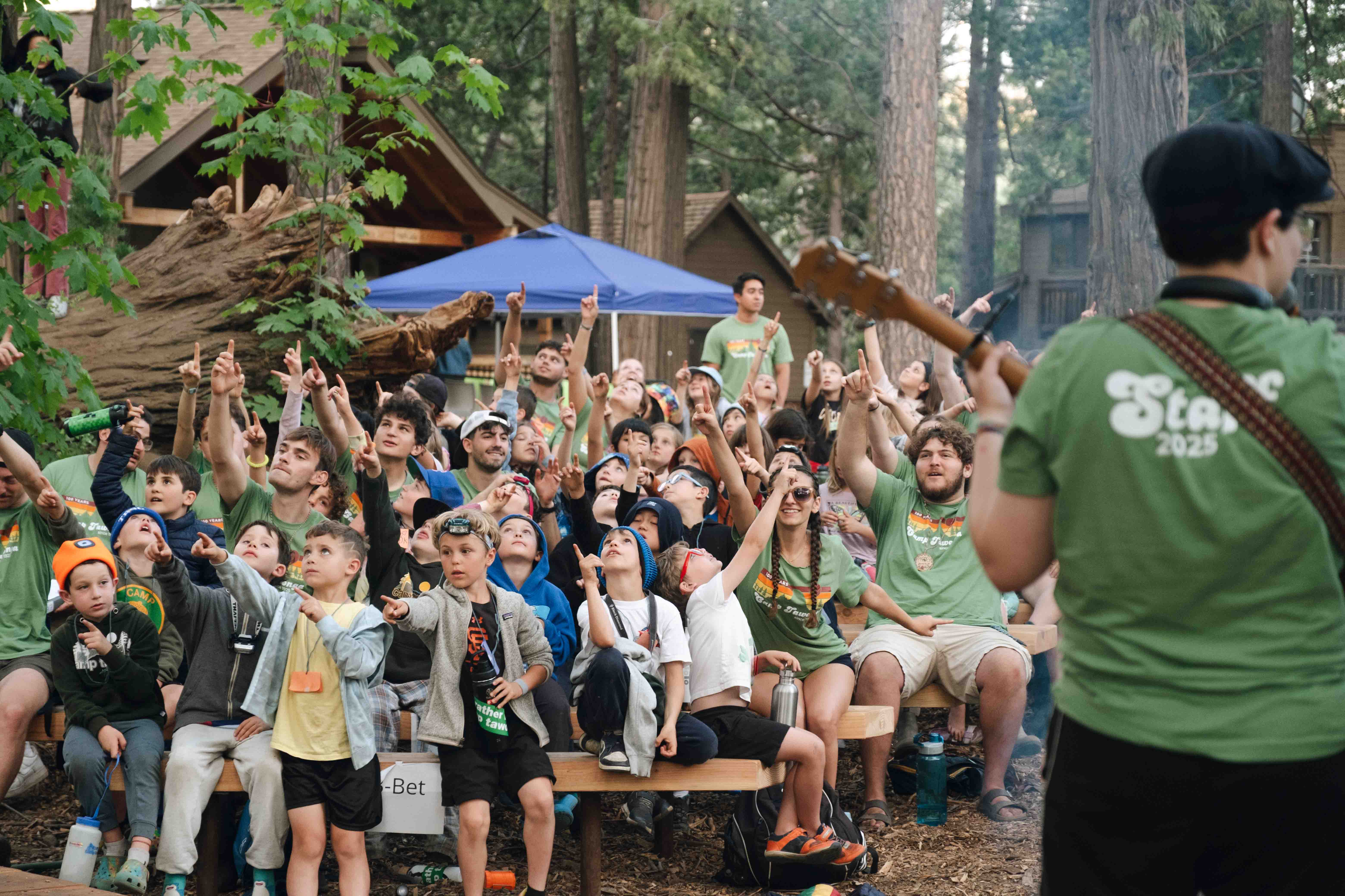 After enjoying their first dinner in our historic Dining Hall, the whole Camp got on their feet for a spirited song session – complete with fan favorites like “Country Roads” and “B’tzelem Elohim.” From there, we headed to our opening campfire, where departments introduced themselves through skits and songs. We wrapped up the evening, as we always do at Tawonga, with the gentle Hashkivenu prayer asking for comfort and peace through the night and our beloved “Friends, Friends, Friends” closing song.
